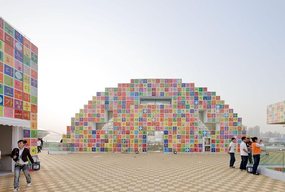 Loaded with symbolism, the two storey, 6,000m2 pavilion – one of the largest at the Expo and the largest ever for South Korea – is covered by a layer of 40,000 pixel-panels. The colourful han-guel "art" pixels are designed by Korean artist Ik-Joong Kang. Like an 20m high SMS, individual pixels are highlighted to create letters.