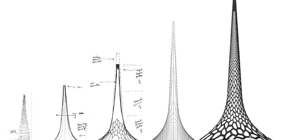 The tower is divided into three sections, tapering from a base of approximately 30m x 25m to 3.0m x 2.5m at the top. It comprises of 187 individually cast hexagonal blocks, weighing up to 18 tonnes each. The individual internal hexagons are pre-cast white concrete, which were lifted into place on site using a variety of cranes including one of the largest in the world, a 550 tonne mobile crane.