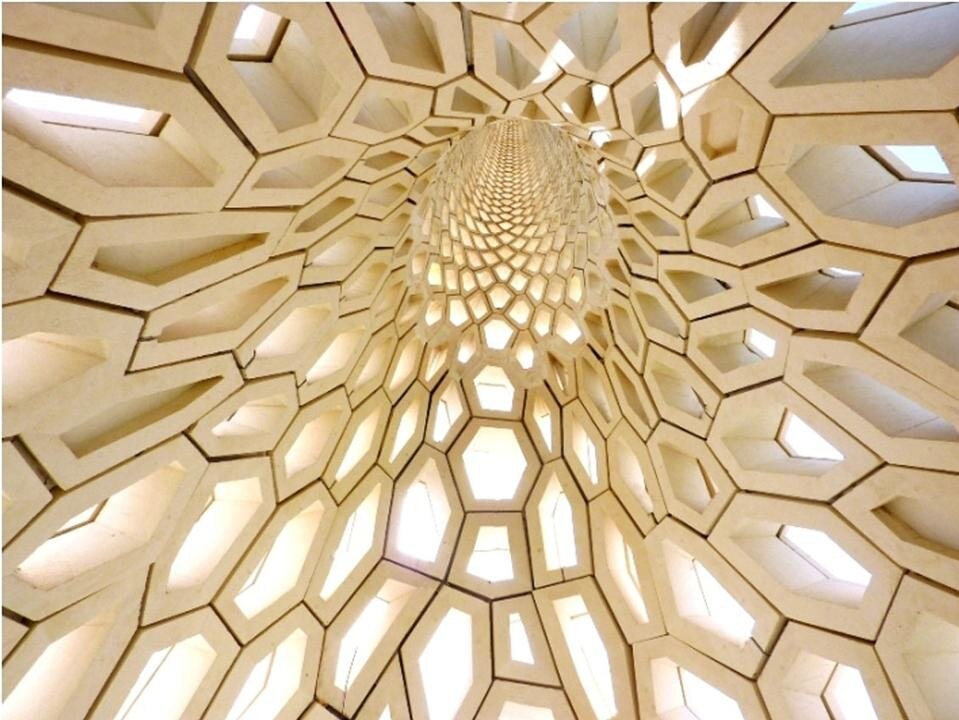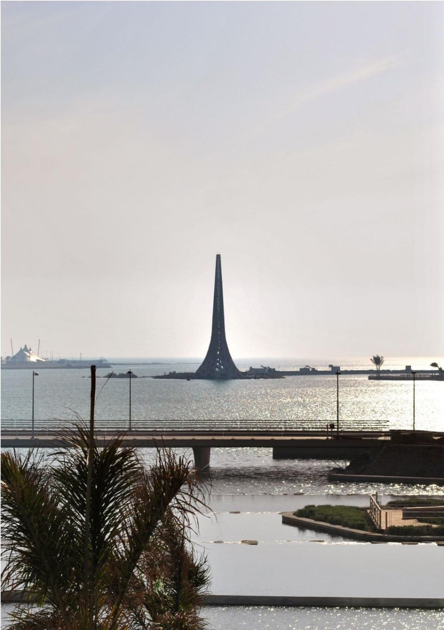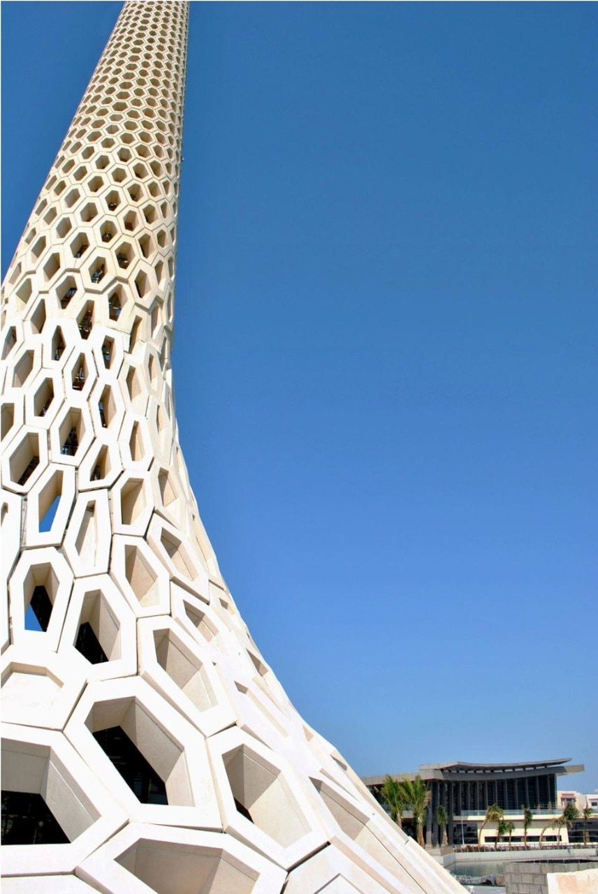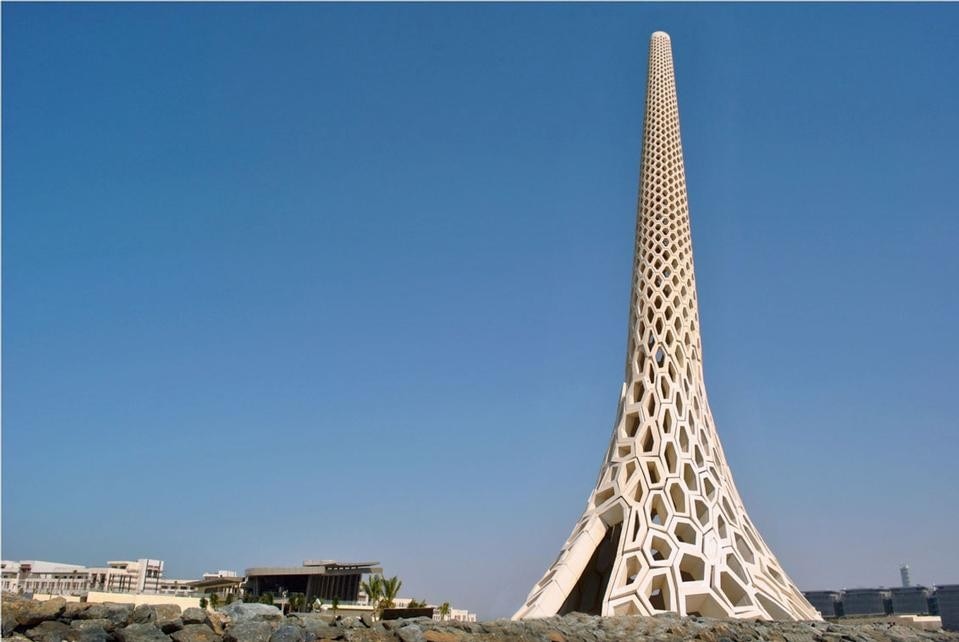 Designed by Australian-based Urban Art Projects, the tower draws inspiration from ancient Arabic maritime tradition and architectural detailing, linking to the marine ecology of the Red Sea. Its complex structure is a collection of unique amorphous hexagonal sections and the patterned skin of the atrium creates a dappled shaded effect, forming interior spaces for communal gatherings with an amphitheatre and reflection pond.
