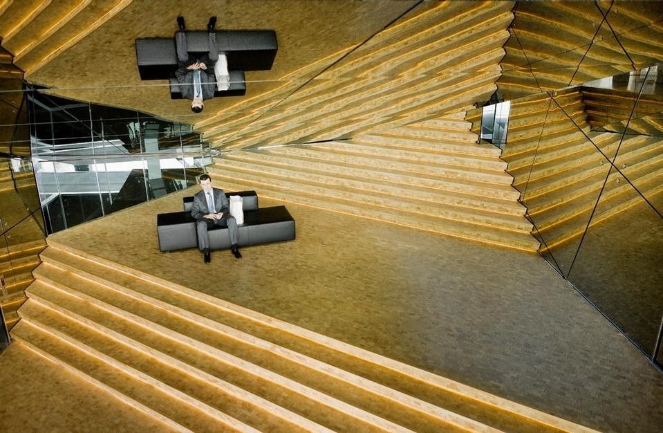 The complex steel structure applied to the existing 1980s' hotel construction consists of six boxes that cater for the different programmes contained within Vakko's headquarters (showrooms, auditorium, library, meeting rooms and offices). The building's interiors are basically formed and enveloped with combinations of glass and mirrors. These mirror-glass interiors reflect the spaces and people in endless spatial relations, with every single movement expanding in images that seem to fold in on themselves.