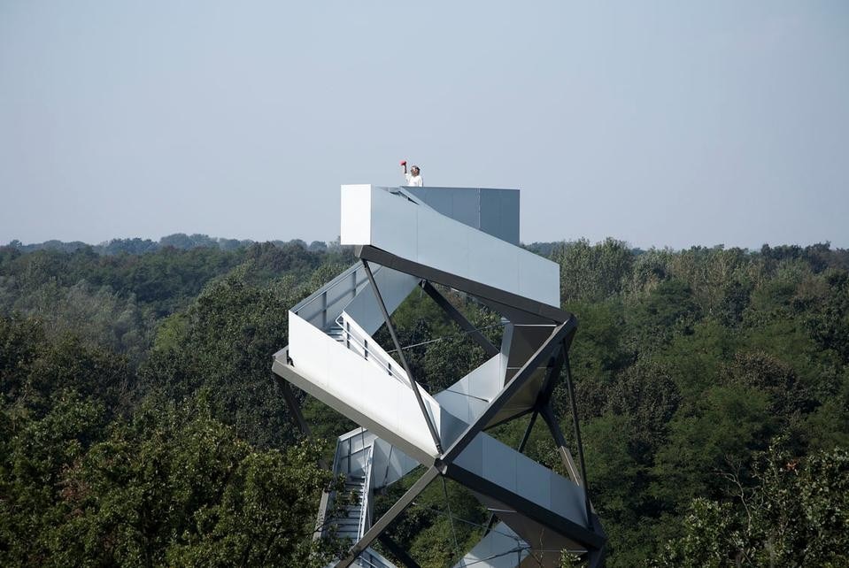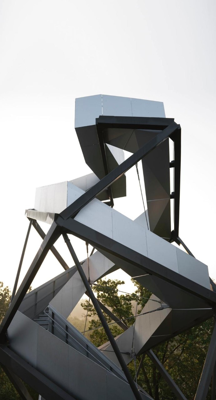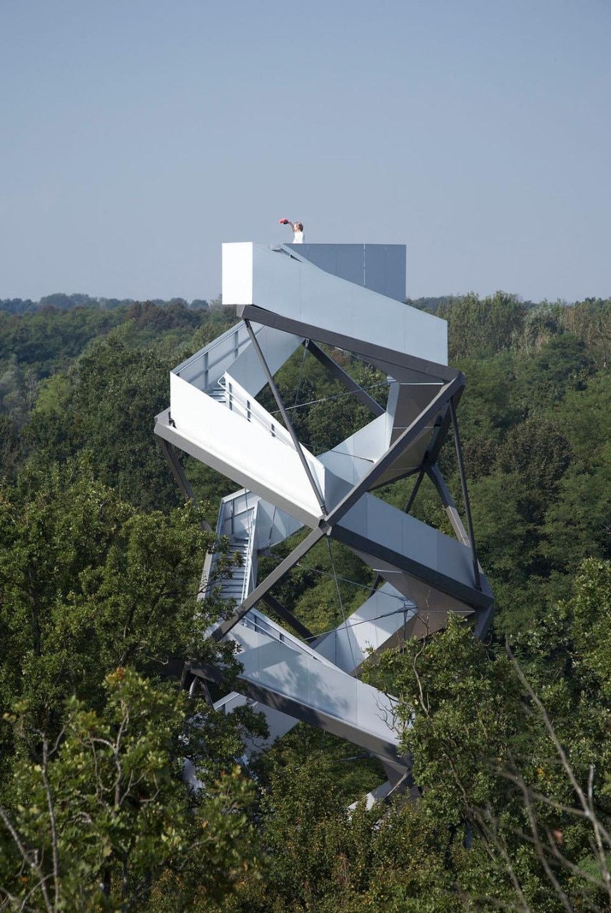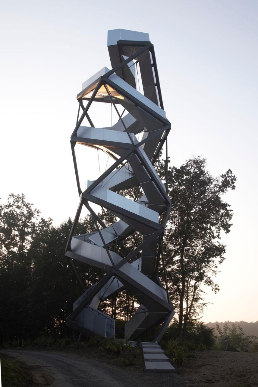 The 168-step aluminium-clad staircase was commissioned as part of a project to mark sites along the European Green belt. The structure curls back on itself at the top, forming a double spiral so that visitors on the way up pass those on the way down. It's entirely steel jointed with aliuminium-clad stair balustrades and bevelled aluminium boards, simultaneously contrasting and reflecting the dense forest around.