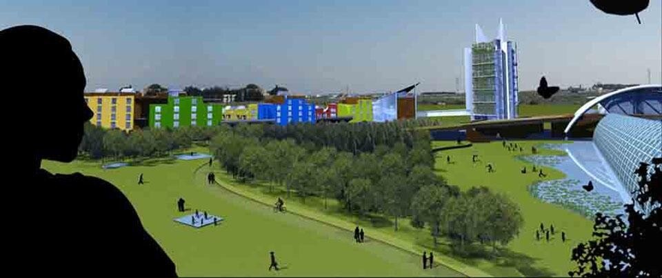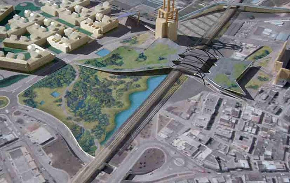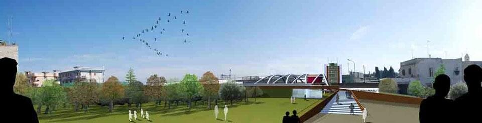 The presence of a railway right on the edge of the area contiguous with the historical center was an ideal opportunity to build a raised plaza (covering a stretch of the railroad tracks and the new station) and, again along the railway, to locate a market and a park acoustically shielded from the railroad by a large photovoltaic wall, landmark for the neighborhood's energy choice in favor of renewable energy. The solar wall, in turn, is reflected in a lake having the potential capacity to naturally purify the neighborhood's water.