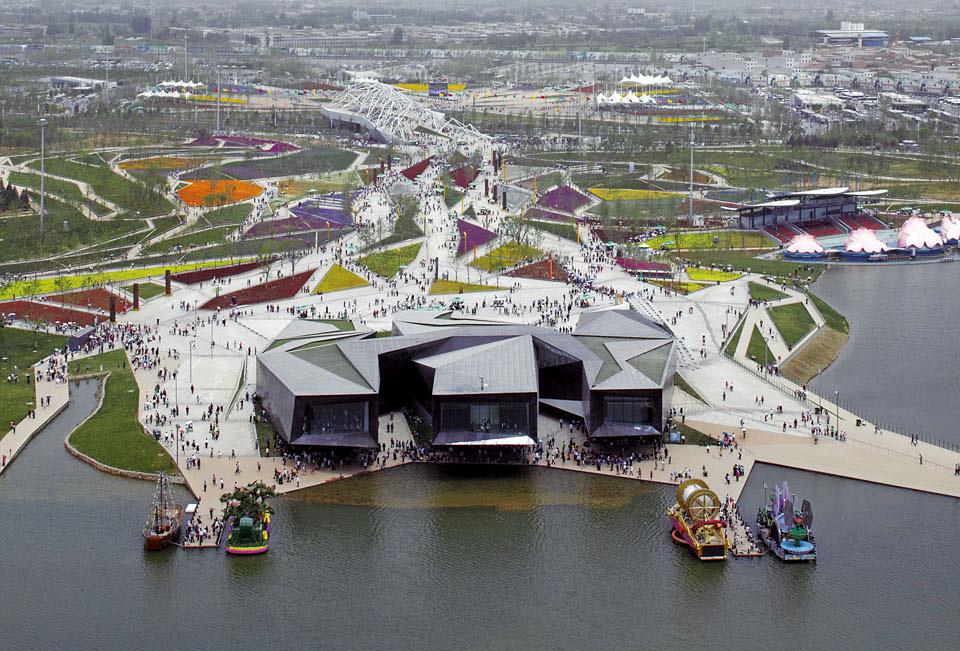 The expo's main entrance is located to the northeast of the site, with half a dozen entry gates leading visitors to a main square. The pavement feels Olympic and orderly, the triangular flowerbeds Arcadian and artificial, while the flowing landscape draws you towards the bridge, which crosses the 60-metre-wide Expo Avenue and offers a panorama of the entire expo site. Rising prominently out of this landscape is the Chinese pagodastyle Chang'an Tower, an observation tower and symbol of the expo. At first it seems that Plasma Studio's other two projects are nowhere to be seen. I spotted the constructions thanks to the queues of people standing outside them.