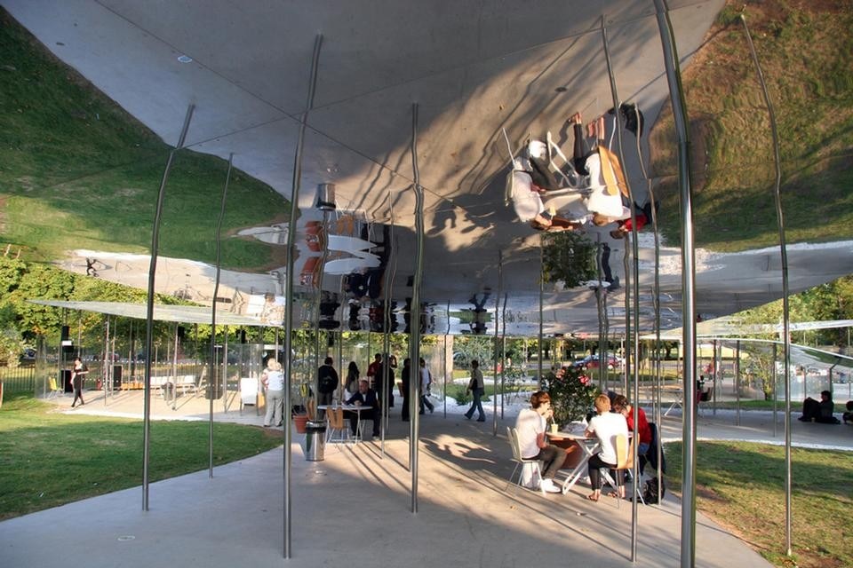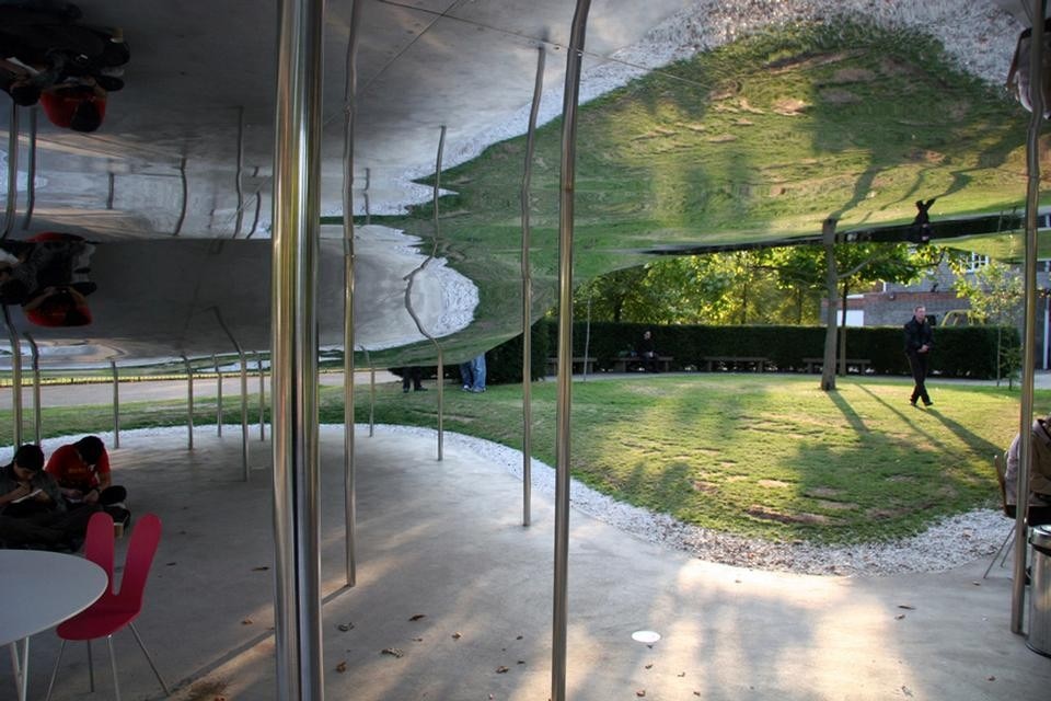 The surface of the roof begins to draw comparison with the work of Magritte. Its highly reflective aluminum creates a mirror on both the upside and underside plane, it is simultaneously recognizable as a ceiling plane and sheltering component in the structure but also comes as a visual continuation of the surrounding parkland. The sky and ground collide within this cosmetic application, in its reflection both sides of sky and ground are trapped, leaving the viewer a little bewildered as to where the structure begins or ends. The pavilion is a sheltered extension of the park; in paraphrasing the architects, it works as a field of activity with no walls.