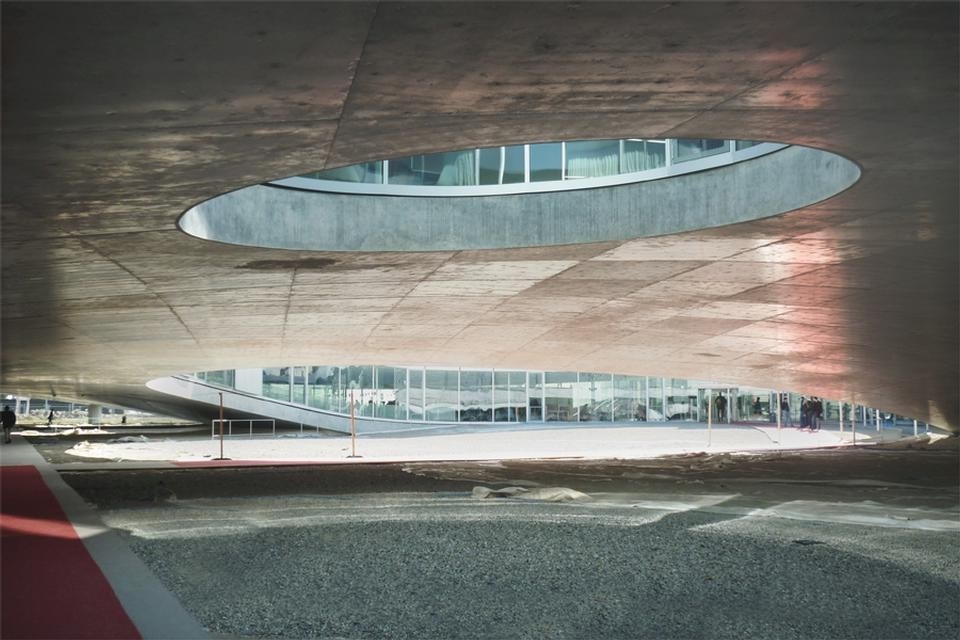 In addition to spatial trickery, there is a heightened notion of perceived structural instability provided by the relationship between light and heavy ceiling elements in each of the projects. The remarkably large spans of the Learning Center cultivate a sense of perilousness for the user standing underneath, an idea replicated in the Teshima Art Museum through the cantilevered structure that emanates from the ground plane. To achieve such large spans in the Learning Center, a laser cut formwork system was fabricated to cast the concrete. At Teshima, concrete was poured over a built-up mound of soil. Once the concrete had set, the earthen mound was excavated leaving a domed hole behind. The construction equivalent of displacement. Both methods of construction allow for a sheen or smoothness—almost a softness. The finishing is exquisite, deflecting notions of the sheer weight carried by these spanning structural arches as they suggest impossible weightlessness. The Serpentine is a prime example. Its flimsy ceiling becomes a projection of the sky in the foreground and the background, constantly changing, shifting and expanding. Moreover, the thinness of the ceiling structure at Teshima is so veiled it becomes removed from its heavy formwork, its concrete materiality. It is almost the definition of 'paper architecture' in the normative sense of the term. The fragility of the structure exemplifies the notion and importance of the interplay between the building and the vanishing point where it touches the ground.