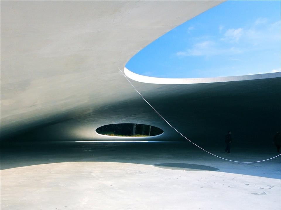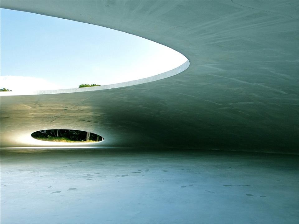When embarking upon the design for Teshima Art Museum, Ryue Nishizawa made explicit reference to the previous projects although this time his collaborator was the artist Rei Naito (commissioned by Naoshima Fukutake Art Museum Foundation). The single volume gallery space is a cavernous dome that is entirely free of vertical support, the ceiling acting instead as both lateral, load-bearing support and shelter. The only apertures come from the two oval-shaped cavities that permit views skywards, creating a thoroughly unique art space. As a consequence, these ceiling vacuums allow the elements to penetrate the space, whether they be aural, visual or climatic. The ceiling is animated by the environment by the fact it is not entirely there; the sky becomes the foreground and enters the gallery space as the ceiling diminishes into the ground. In plan and section, the design for Teshima resembles a droplet of water. The globulous form is oppressive yet open, it stirs emotions of being outside and underneath at the same time. An overbearing Surrealist sense of being inside a droplet looking outward or viewing scalar objects from above. A removal of perspective and dimension. This project could well be likened to James Turrell's career-defining project Roden Crater, in the Arizona Desert, however, there is a reference that predates this. When viewing photographic imagery for Teshima there is an unmistakable, uncanny resemblance in the building's aesthetic appearance and disassociation of elements to the Surrealist works of René Magritte.