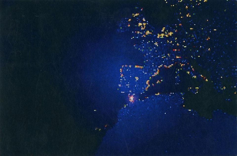 Postcard #166. [above] A reconfiguration of the great economic and political centres of Europe, a new metropolis straddling two worlds, no different from the other except for size and quality. Electric light, symbol of 20th-century modernity, ensures the correct density in the project; at night, the city's visual noise creates more sharply-defined boundaries and transforms the symbol of a shift in the keystone of permanence of cultures in a perennial state of "approaching." Planes take off continually and ships dock in what clearly is the New Alexandria.