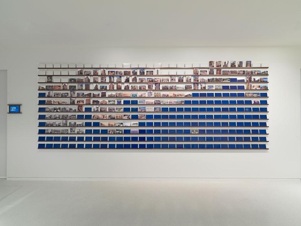 The colour of the architectural blueprints inspired not only the exhibition's carpets but also the institutional communication