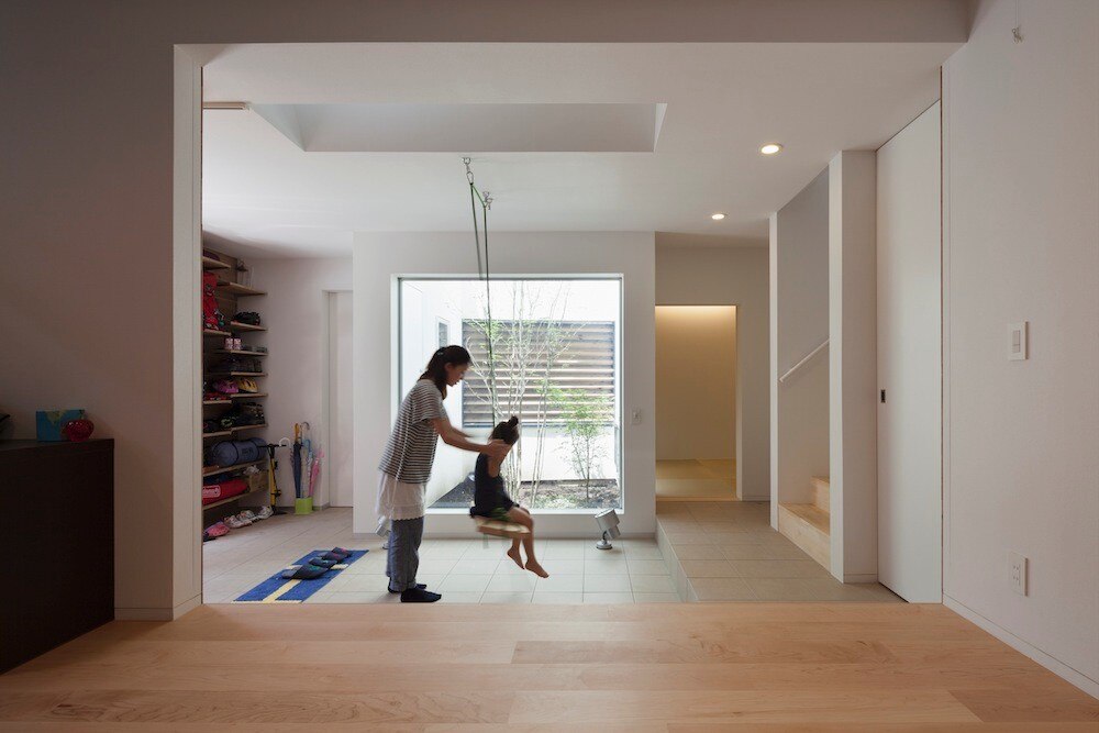 Level Architects cuts away the Western corner from the extruded volume of the three-storey family house in Ofuna’s site, creating a focal point within the house and enabling, at the same time, a connection to the surrounding exterior environment.