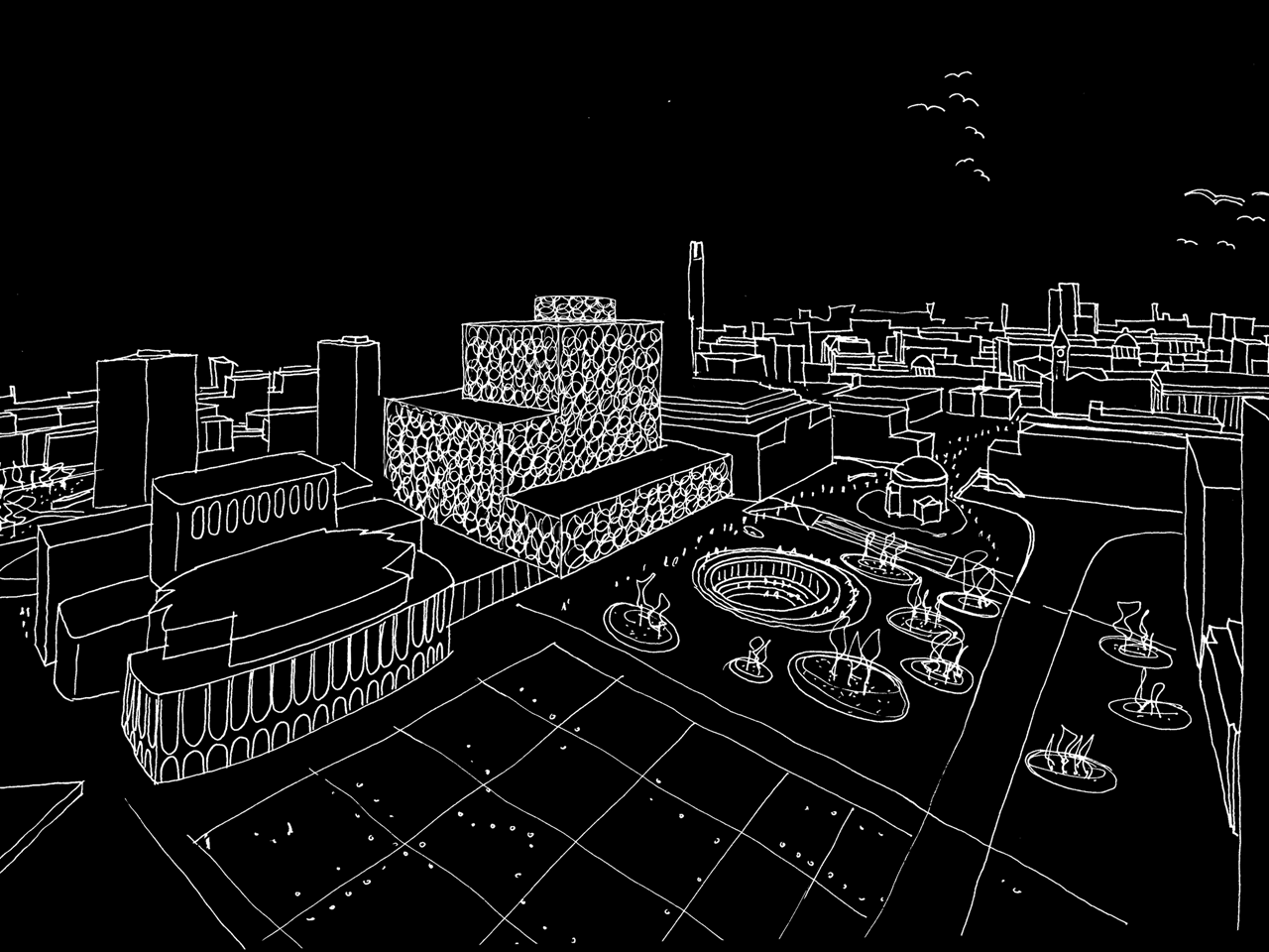 Programme: 35,000 sqm library with adult and children’s library, study centre, music library, community health centre, multimedia, archives, Shakespeare Memorial Room, offices, exhibition halls, cafes and lounge space, roof terraces, new shared auditorium (300 seats with neighbouring Repertory Theatre, interior design and urban plan for Centenary Square