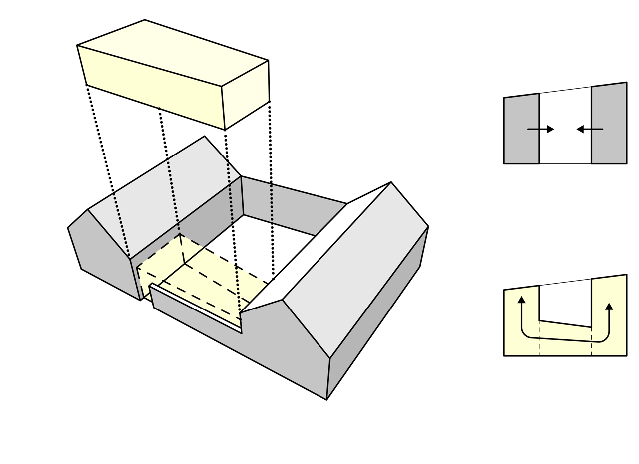 Façade: south side: existing enclosure wall with top-lighting; north side: floor-to-ceiling aluminium glazing with sliding doors