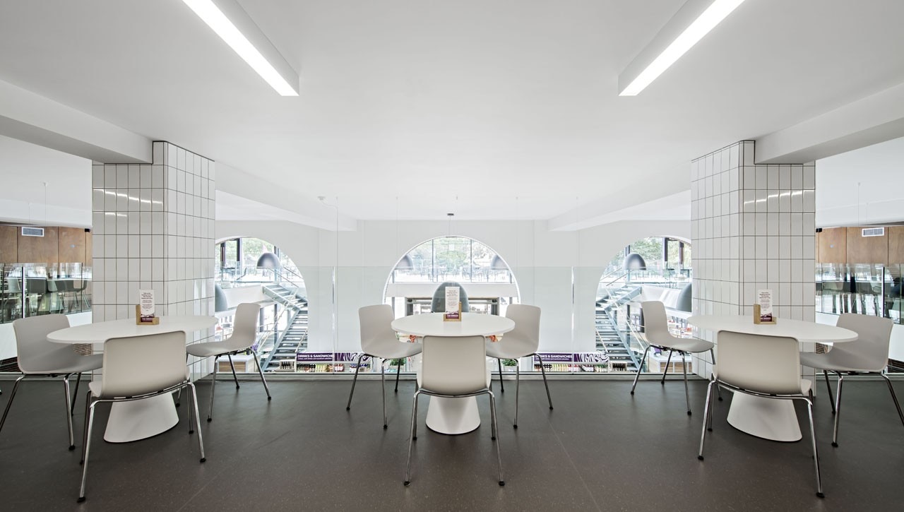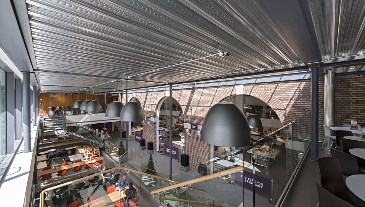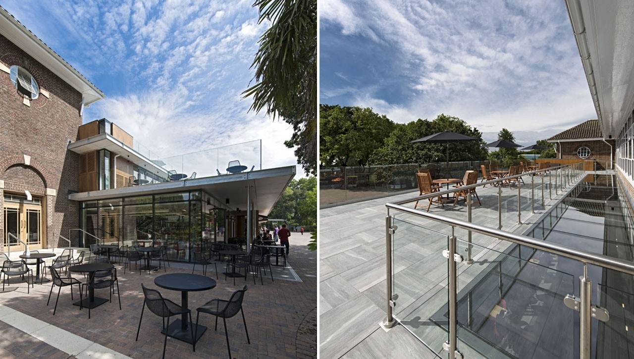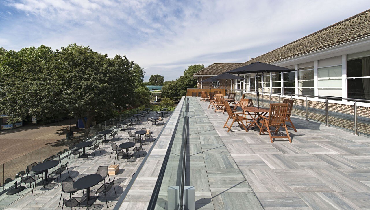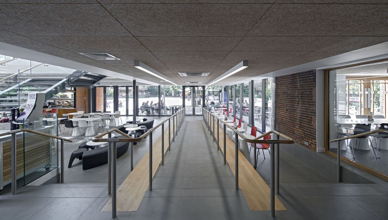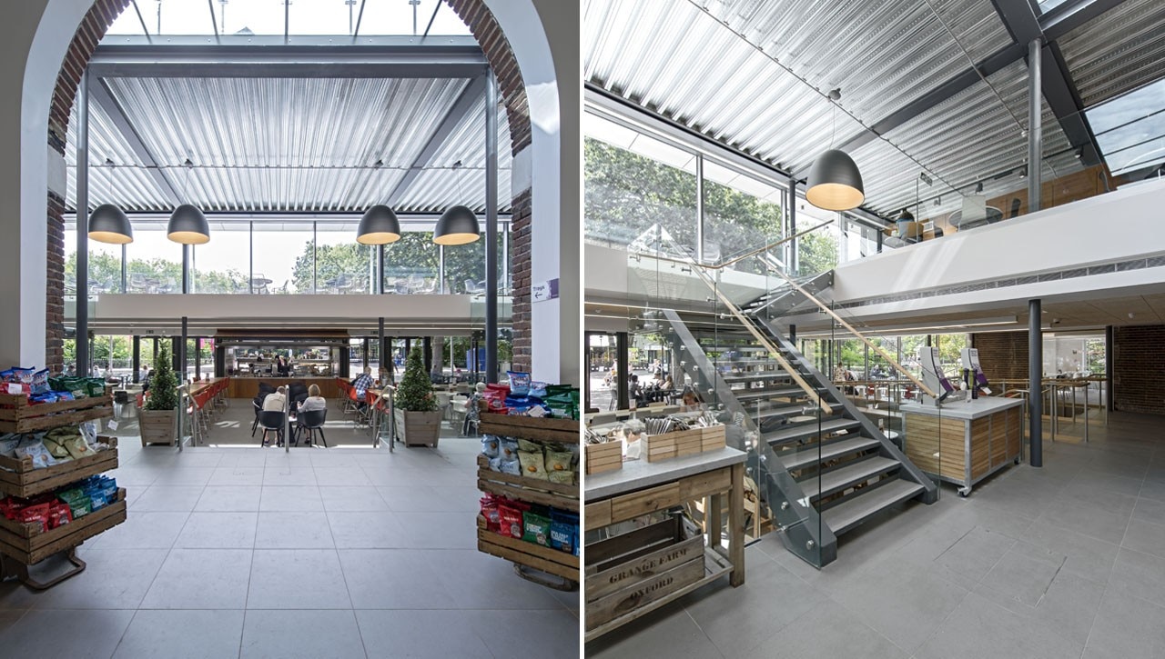 Externally, soldier course block paving announces the new building and separates it off from the herringbone paving of the external square. Outside seating and tables are part- canopied by the building’s overhang for maximum solar shading. South- facing, full-height curtain wall glazing to the front of the extension is punctured by six 2,5 meters-tall doors. At the centre of the glass front to the extension sits a double-sided and folds upwards on opening to create a canopy. When closed, it looks to disappear into the building. Steel-framed, cantilevered stairs with glass balustrades for an open feel lead up from both sides of the ground floor to the extensive mezzanine seating area and the terrace beyond, but barely impinge on the stunning, spacious and transparent feel of the building’s interior.