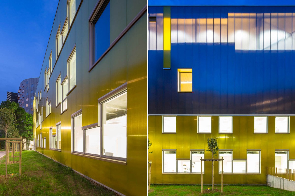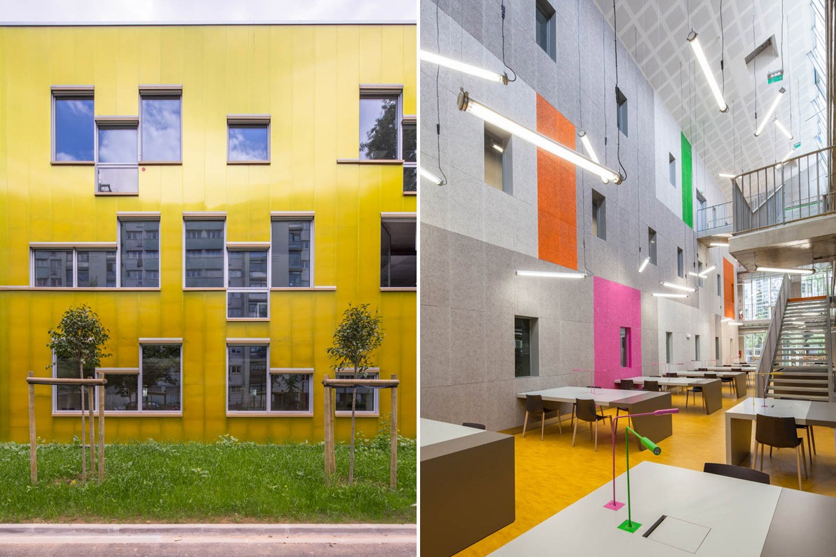The light grey and opalescent of the teaching wing and gymnasium are a counterpoint to these strong colours.