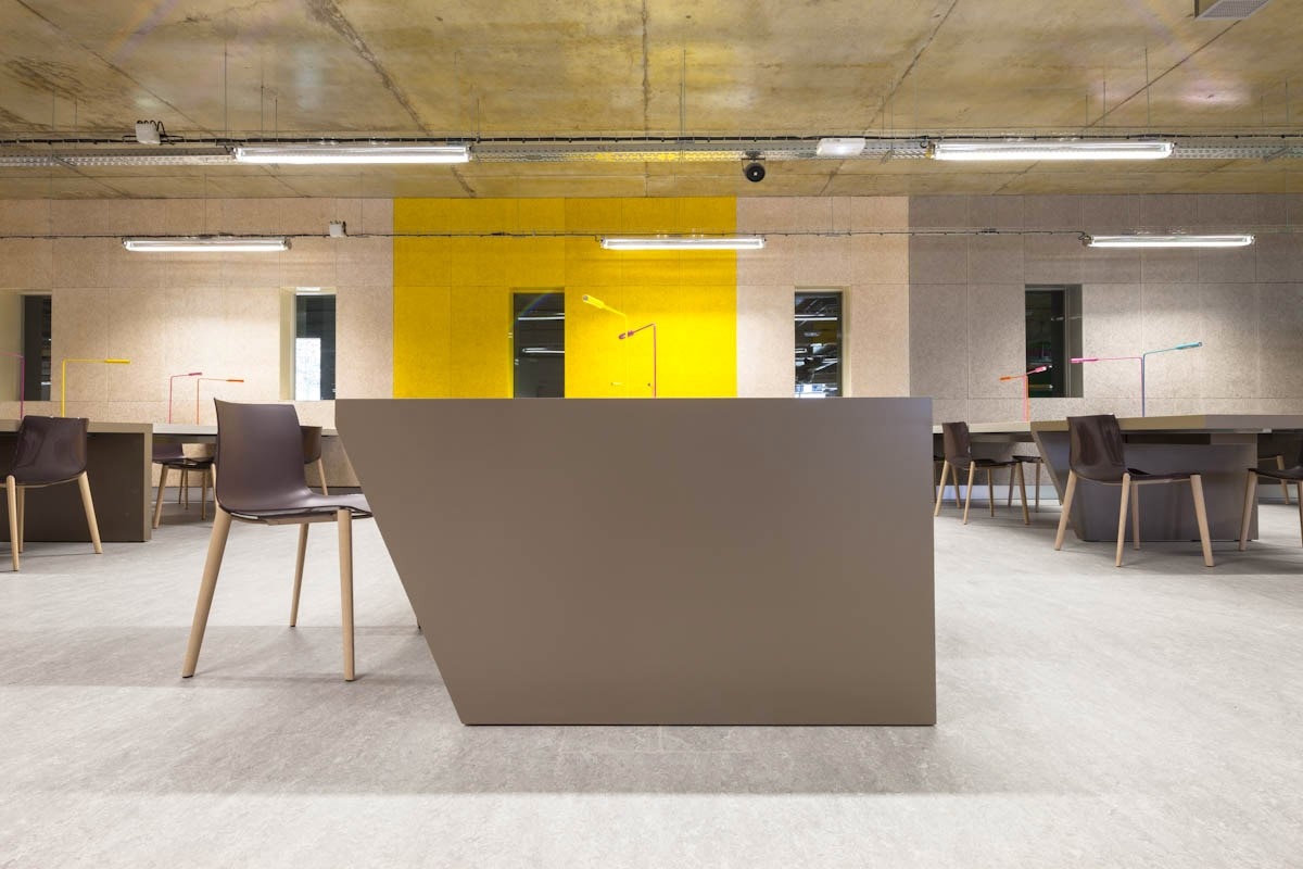 Colours are used to identify each of these volumes by function. The choice of colours reference university symbolism: daffodil yellow, traditionally associated with the arts, literature and philosophy, is used for the library’s envelope, but also links the different buildings through lines and ribbons which echo throughout the volumes. The colour gold emphasizes the auditorium’s envelope, marking it out as the Centre’s flagship building, but also indicating the entrance to the site.