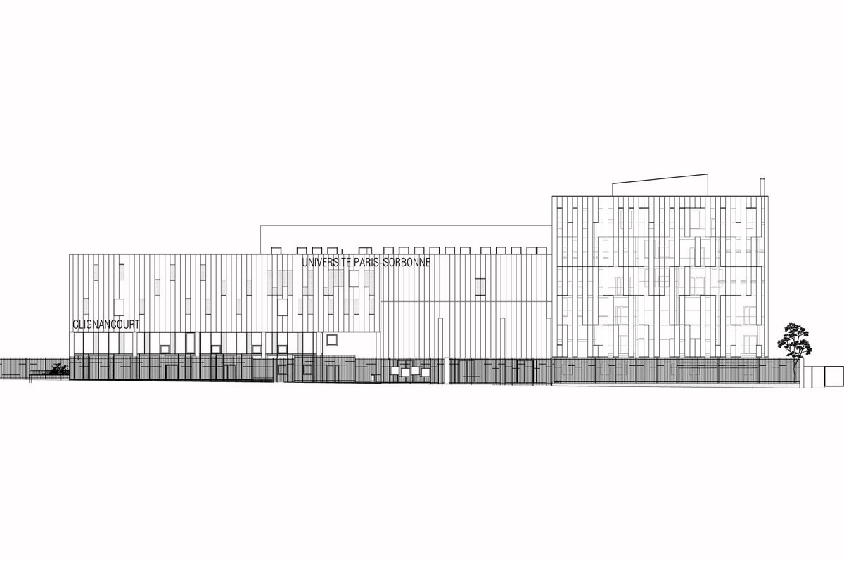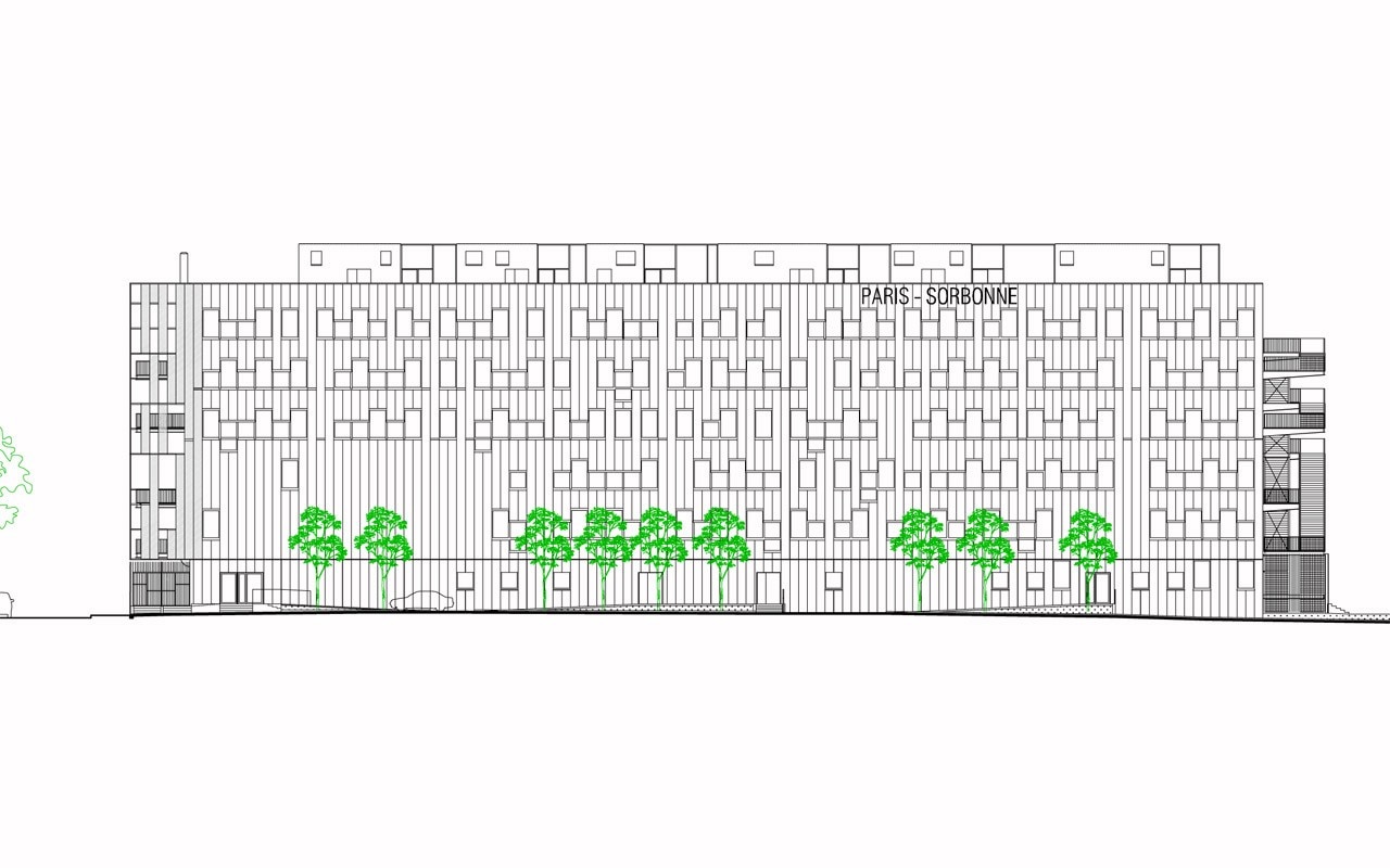 Two imposing structures frame the site to the North and West: the OPAC housing block and the SAGI university accommodation which block views and sunlight, but serve as an acoustic screen against the Beltway. To the East, however, the site is completely open to the vast Poissonniers sports grounds and is bordered to the South by the quiet, residential Rue F. De Croiset.