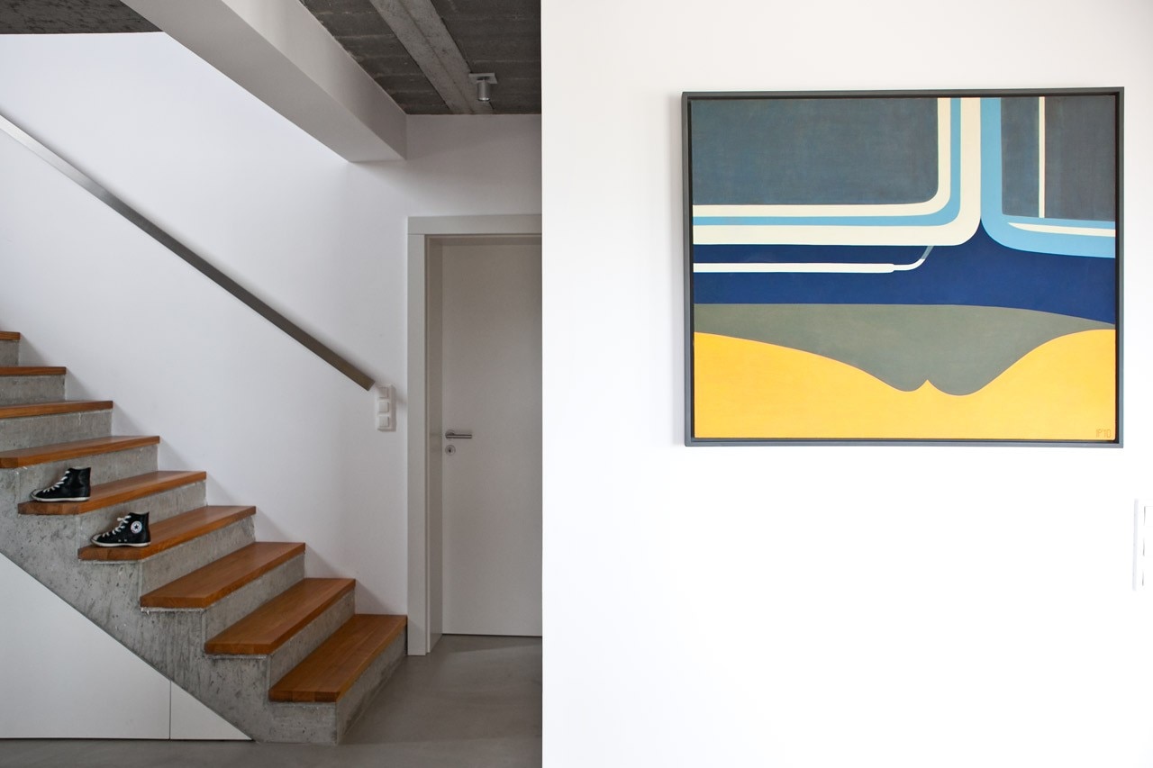 The centre of the house is marked with a white frame, which continues in the livingroom.
