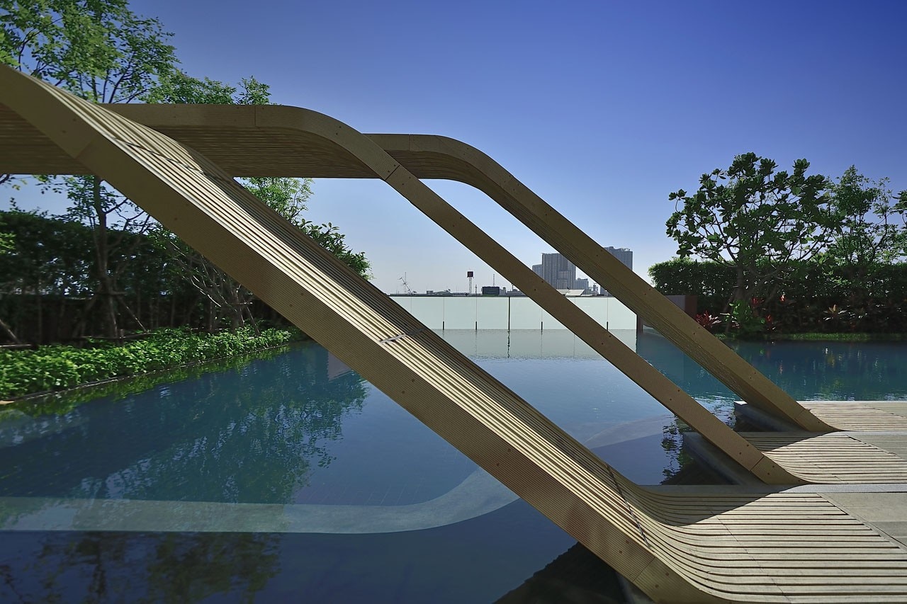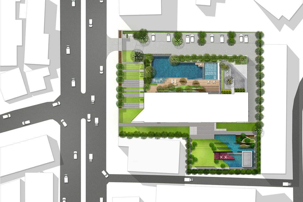 At Wyne, Sanitas Studio has created a series of rich detailed garden spaces from the front plaza, a garden walk around the building, a sculpture garden, swimming pool garden on 5th floor and sky garden on 27th floor.