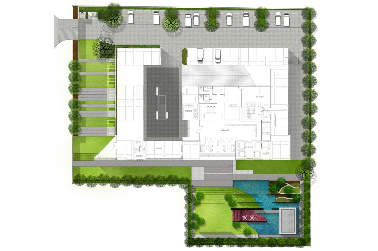 Sanitas Studio’s proposal considered the site as a Sanctuary and aims to integrate planting in every possible areas: a garden walk around the building foot print, a herb garden within a sculpture garden, vertical garden on the building's facade and a rustic garden on swimming pool level.