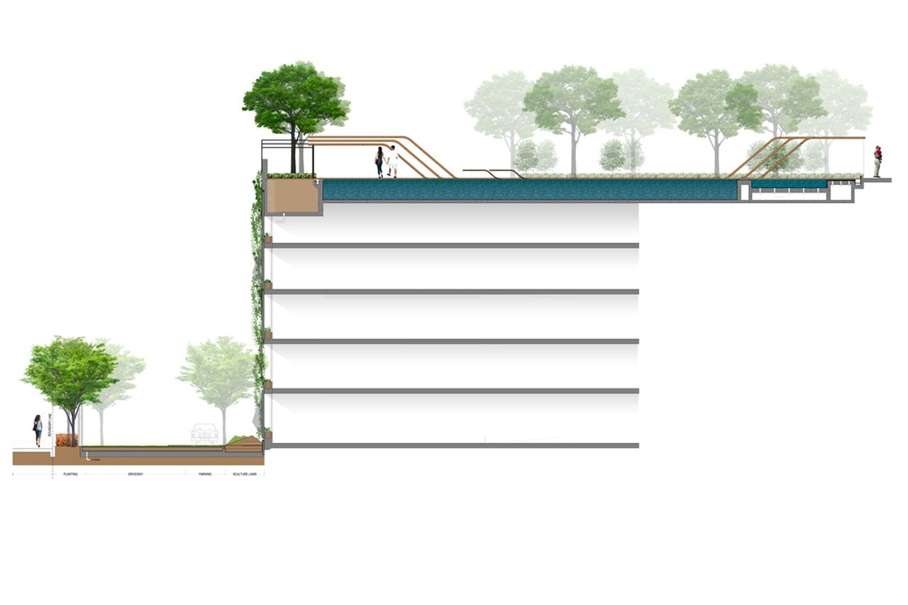 Sanitas Studio also proposed a vertical garden on the front facade of 4 storeys carpark building in order to create a better environment to surrounding neighbourhood and decrease the temperature of the building by buffering the glaring heat, and providing ventilation at the same time.