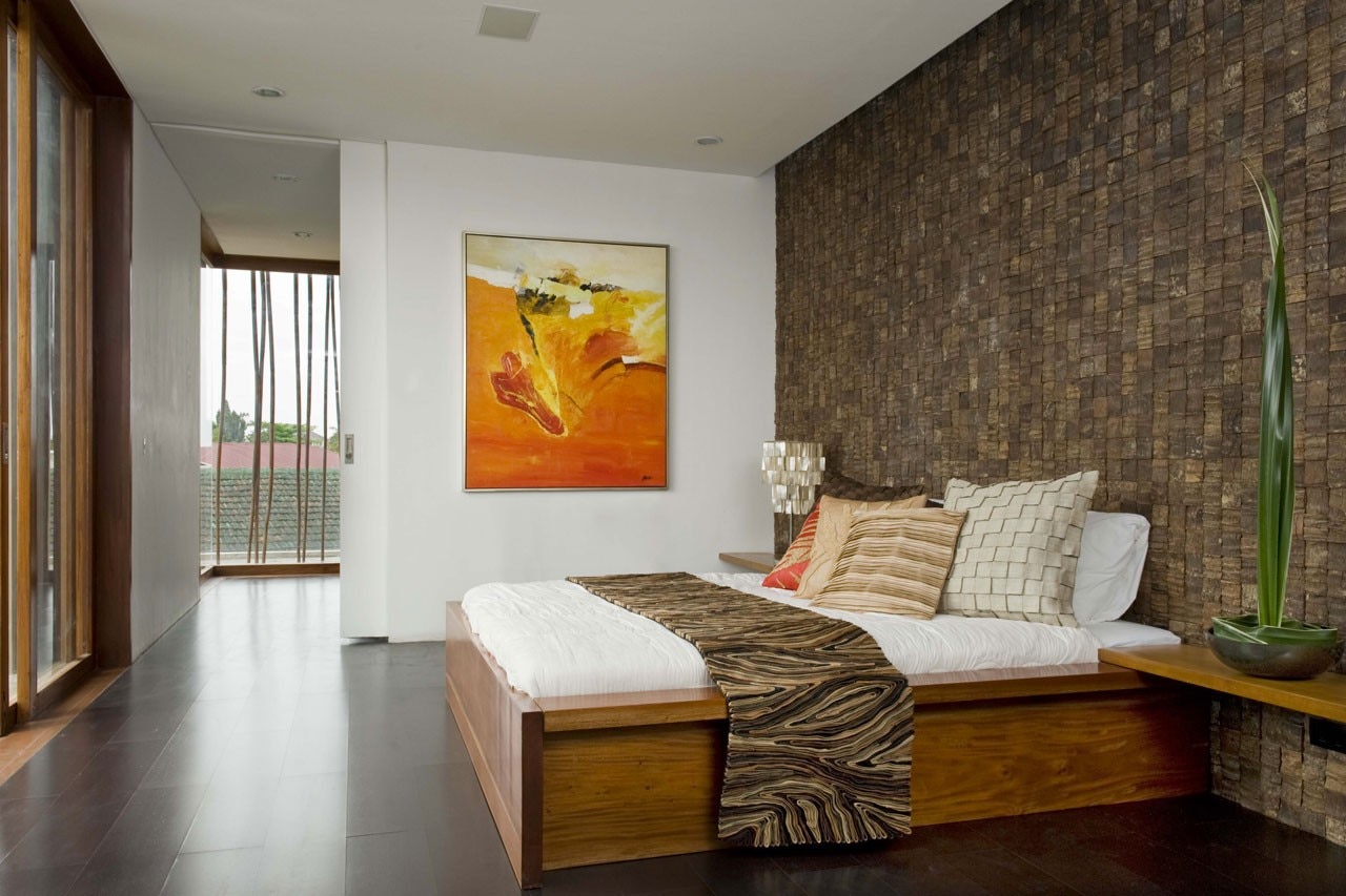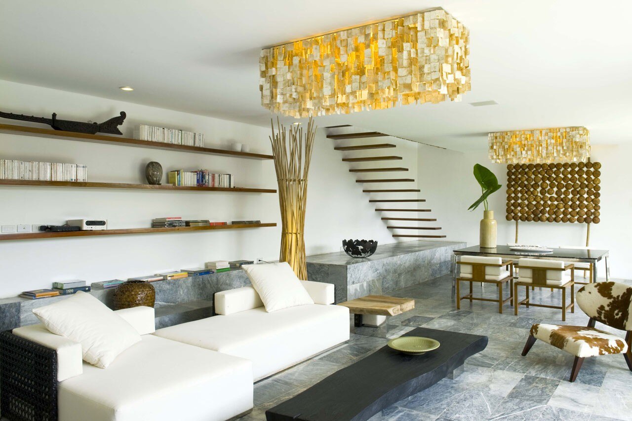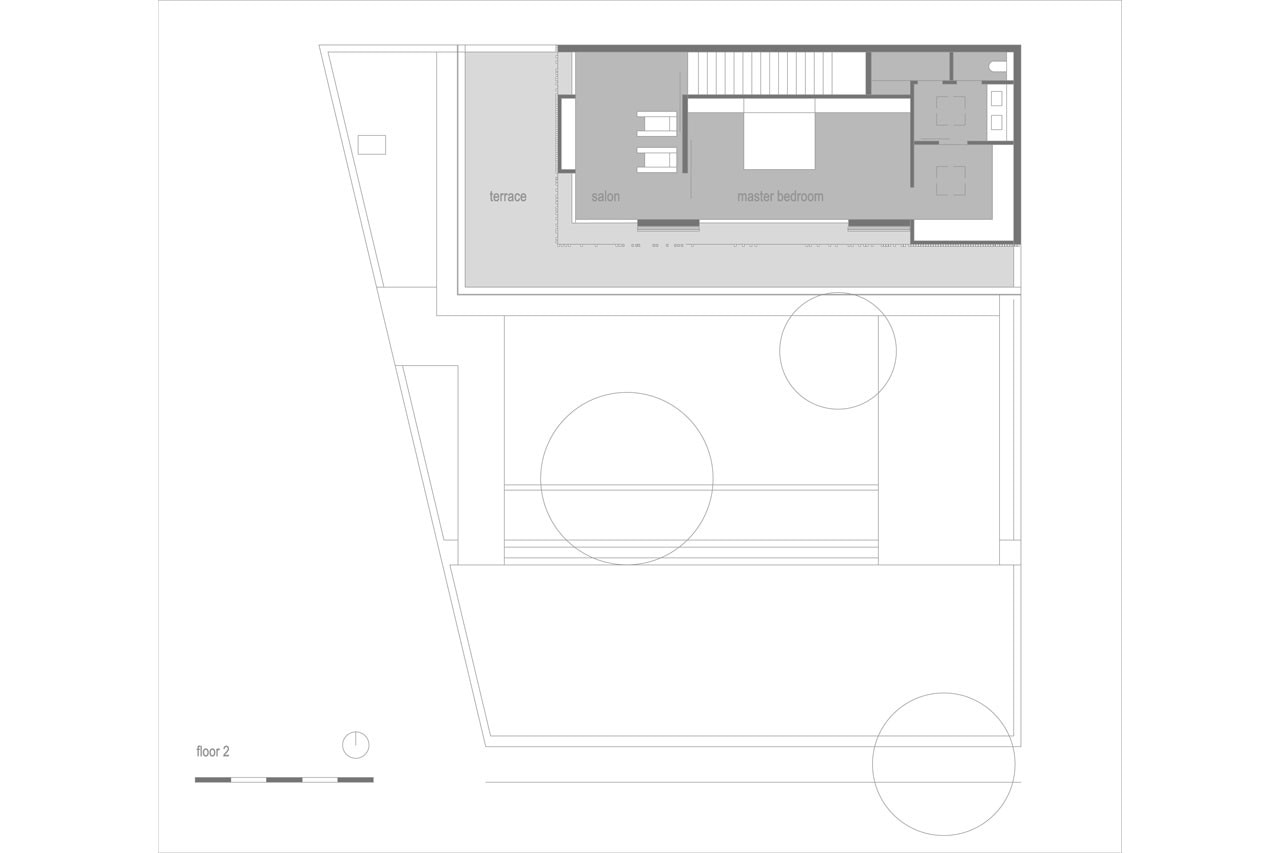 The first floor hosts a family room and a private quarter with two bedrooms along with a guest-office room with access to a roof garden. The master bedroom occupies the second floor with its own salon, changing room and bathroom.