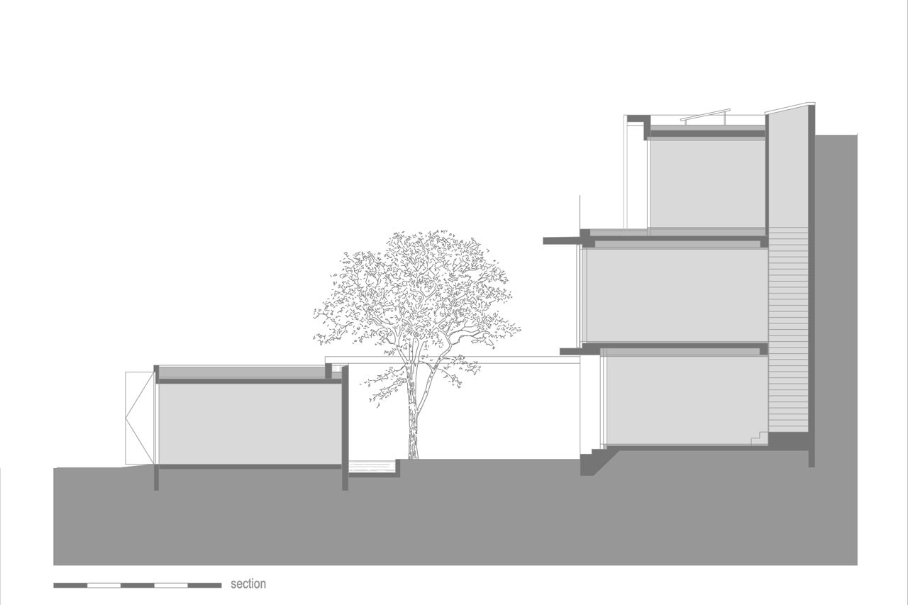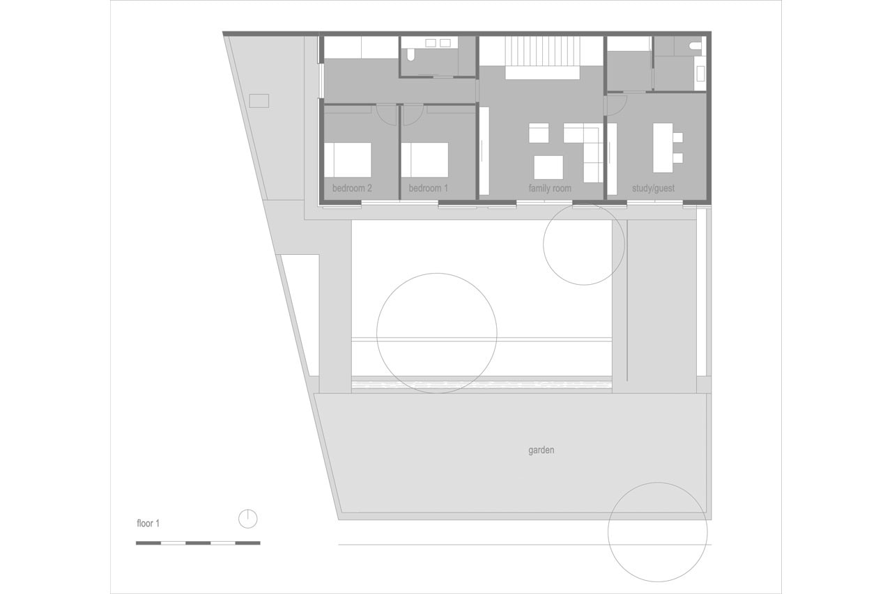 The program is a 465 sqm family house on a 360 sqm lot. The entrance foyer, garage and service area face the access road while dining, living room and kitchen overlook the private courtyard.