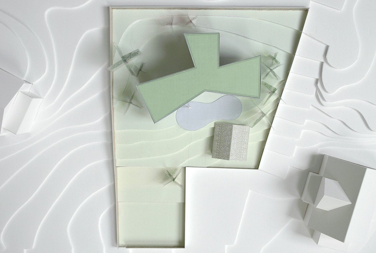 The building’s shape divides the site into different exterior spaces and provides a softly divided sequence to the interior. Not immediately perceptible, the graphic form of the plan results in a building volume that rather reads as a fragmentized whole – from some angles striking, from other angles neat.
