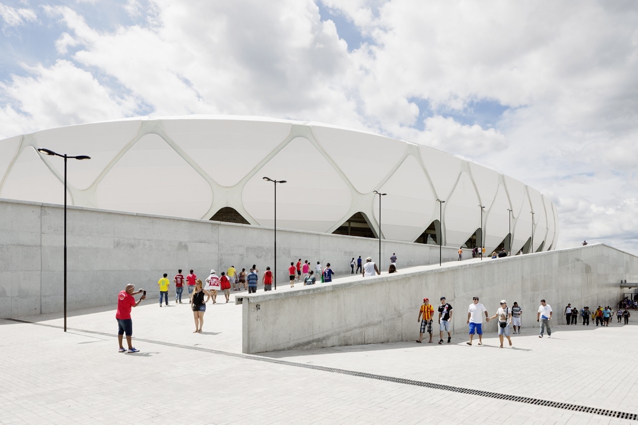 Designed for 44,400 spectators, the stadium is located at the central traffic axis that links the airport with the inner city. The new building was integrated into a sports park with Sambadrome, field and track facilities, multi-purpose halls and an aquatic center.