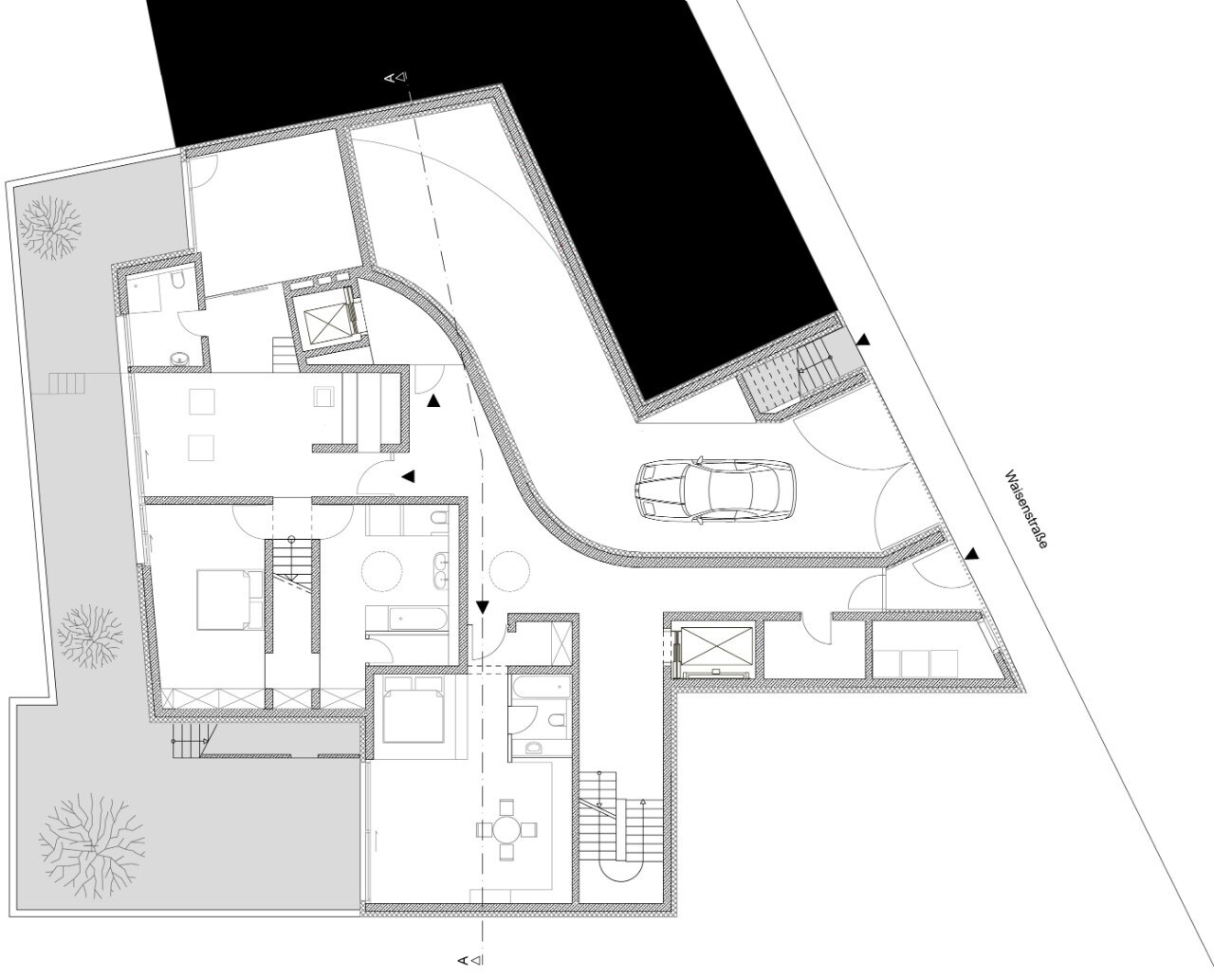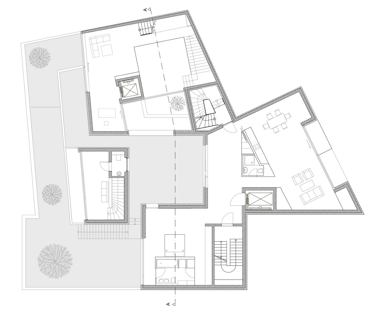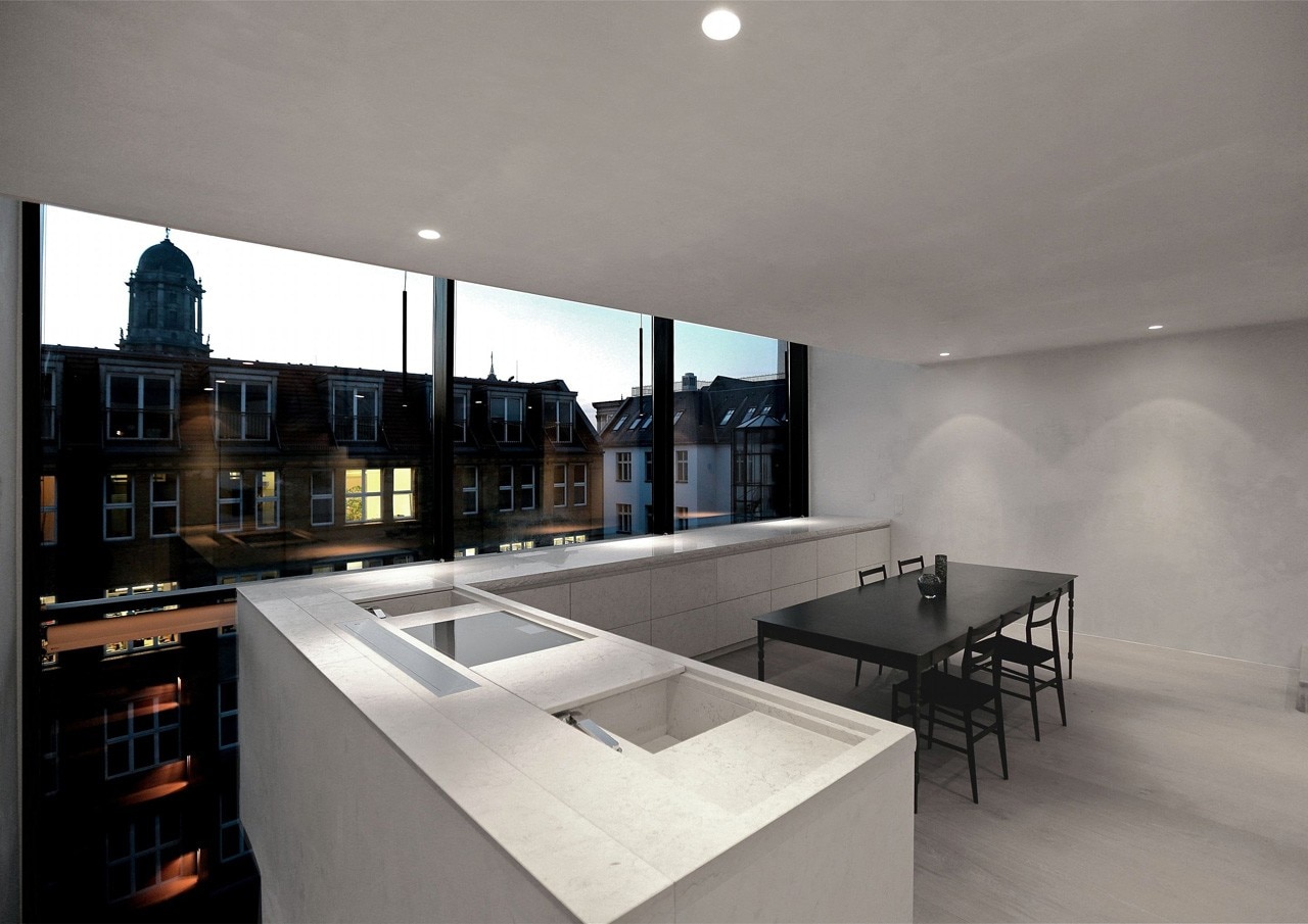 The six-storey front building houses a parking garage in the basement, above five apartments two of which are organized as maisonettes. Two townhouses, five and three floors, designed as independent vertical units additionally accessed via a courtyard on the 1st floor. All apartments have been designed and customized individually. They differ fundamentally from each other yet form a unity.