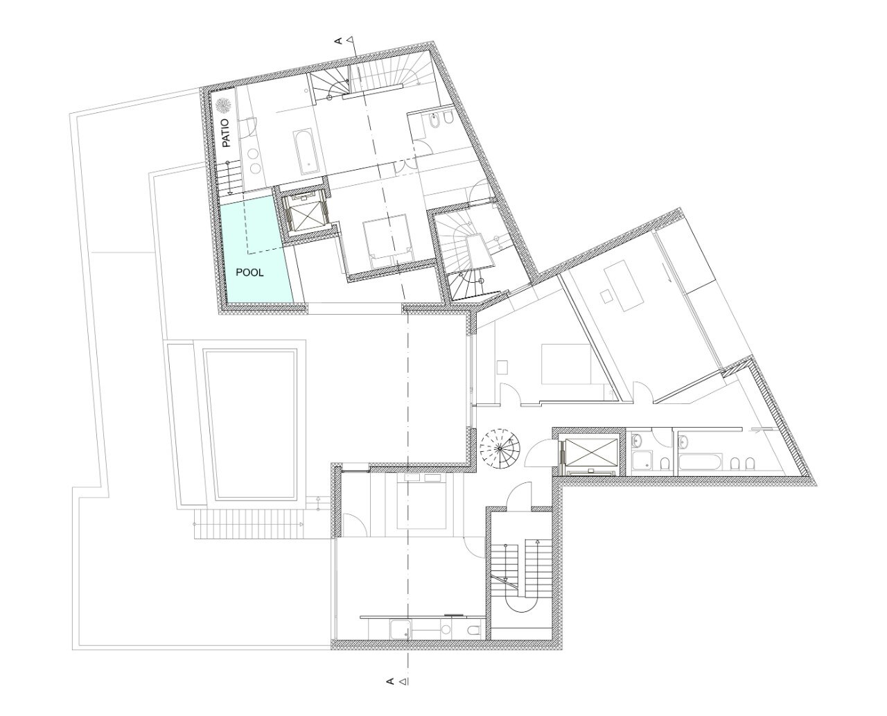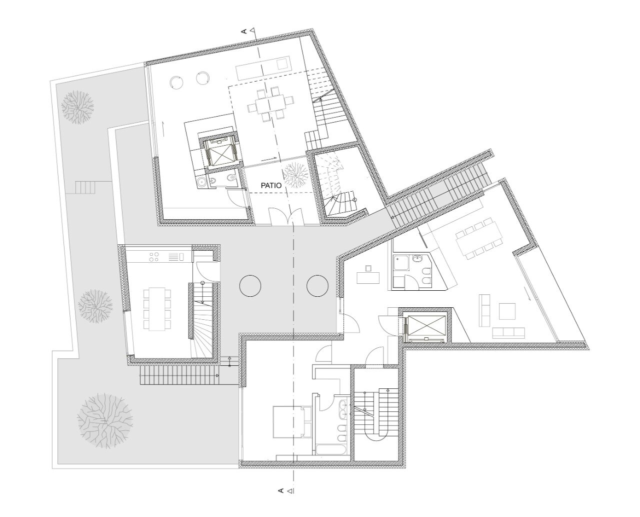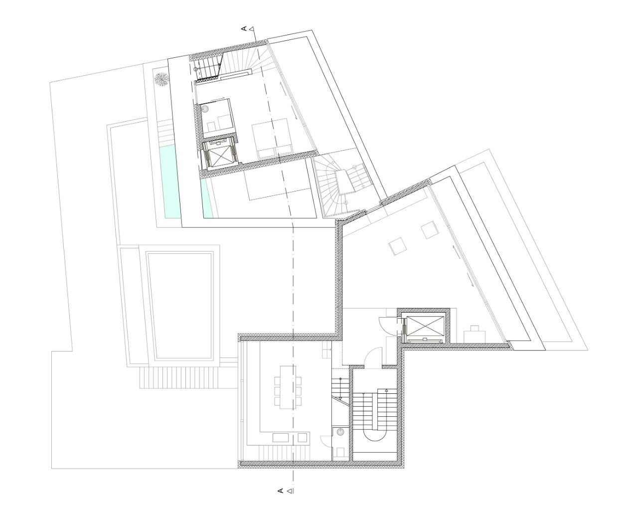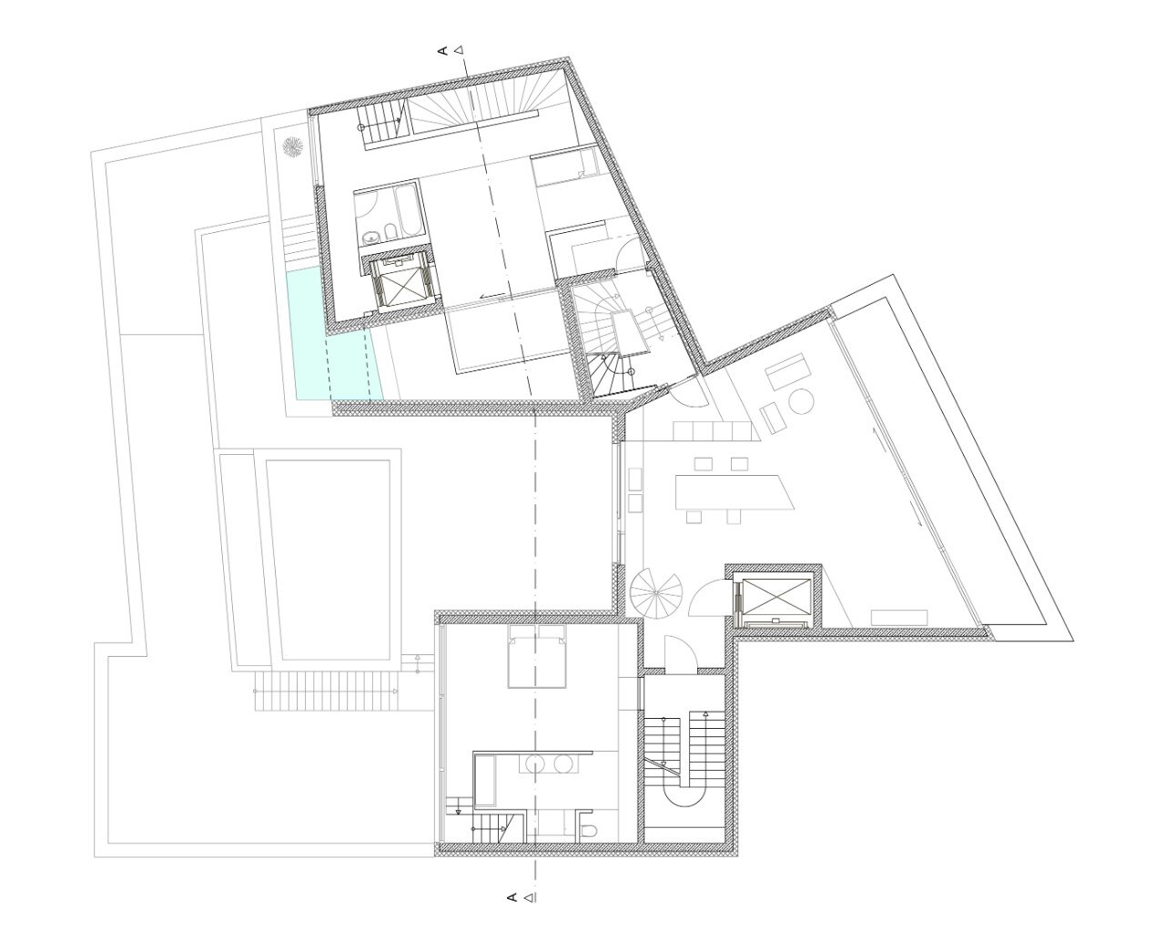 The result is an individually from the inside out developed building complex with a mountain village like structure whose parts individually stretch to the light, for air and into the space, yet withdraw into hidden privacy.