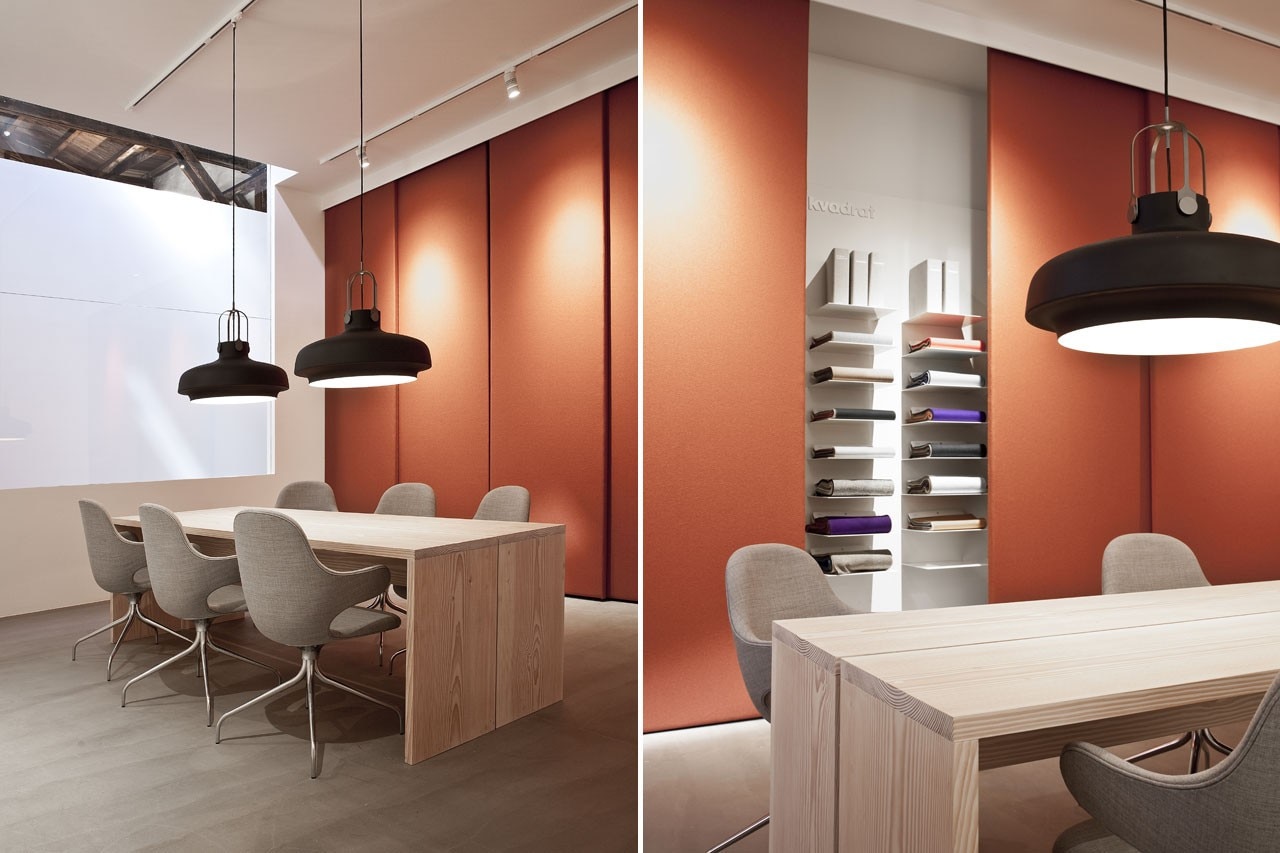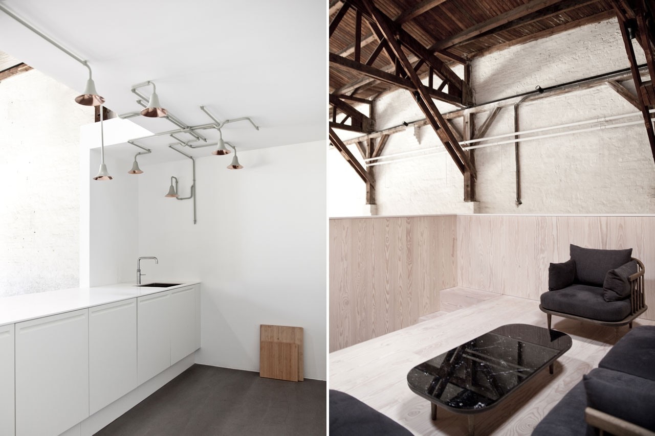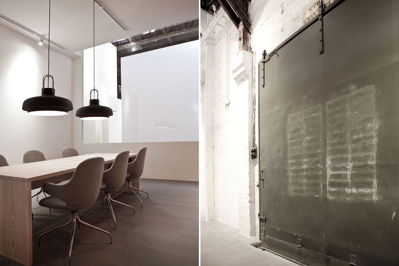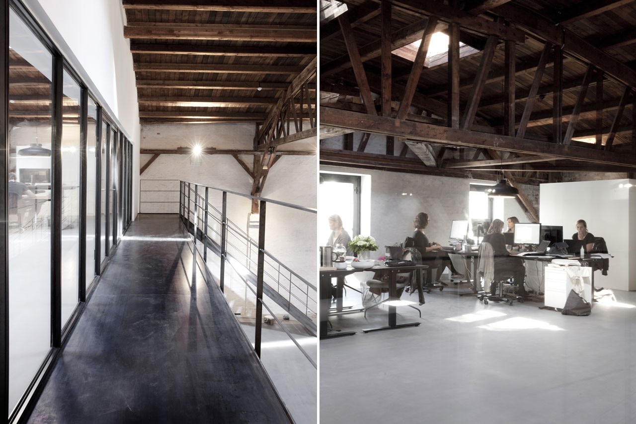 Housed in a sixteen hundred square meter big warehouse, historically used for the storage of paper, the space has been stripped back to its bare minimum. The beautifully exposed wooden roof gables are kept intact and fully visible while the floor is now concrete and resin, creating a smooth matte surface.