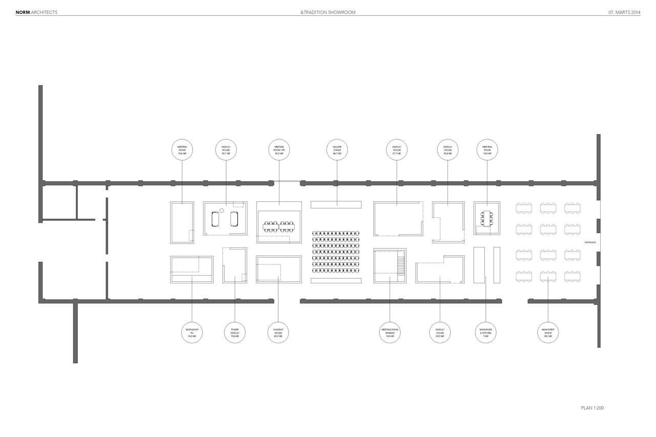 With the impressive size of the volumes in an raw indoor space the visitor quickly gets the feeling of being in a cityscape and with few, subtle and understated references to well know structures, Norm Architects have succeeded in creating a dialogue between inside and outside without using traditional transparency in the architectural facades of the warehouse.