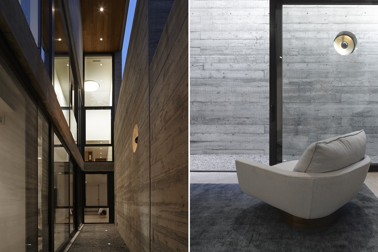 The house forms a complex figure-ground or mass-to-void relationship. It is structured and animated by light and shadow by a board-formed concrete wall, large light well, transparent partitions, and interconnecting void spaces. The concrete wall satisfies unprotected opening building code restrictions on the south wall while allowing light to reach deeply into three levels of the house. The boundary between building interior and exterior is dematerialized.