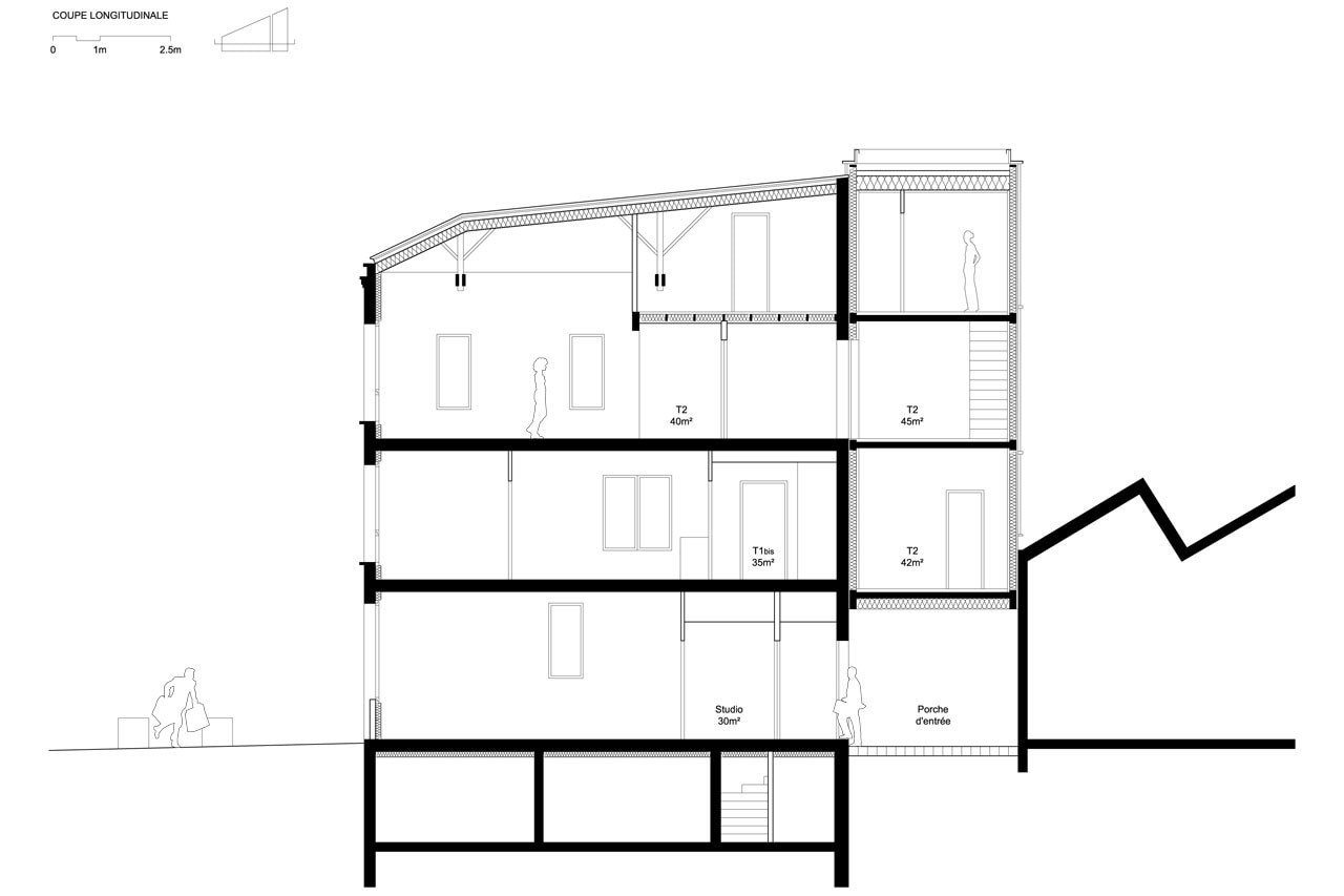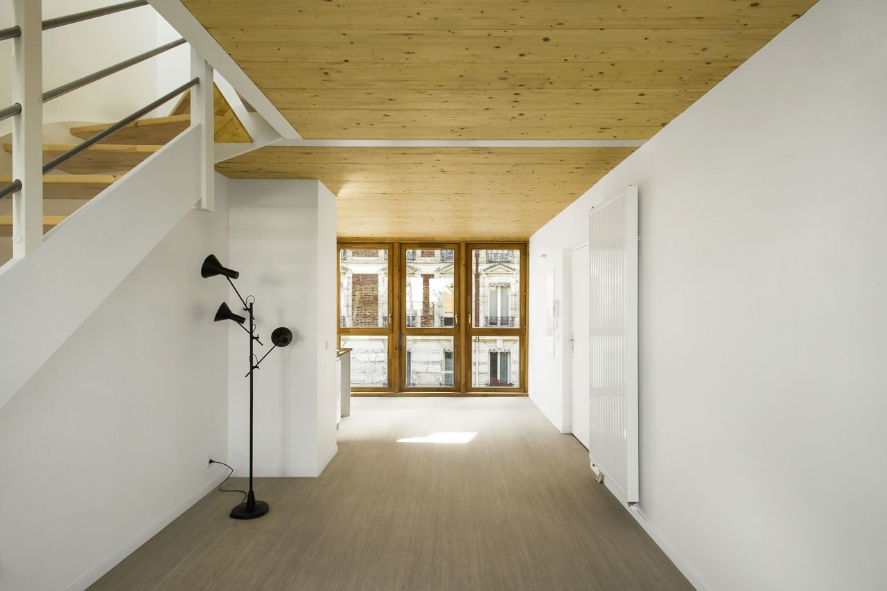 Intended for social housing, the renovation project includes a contemporary timber frame extension added to the back of the existing building.