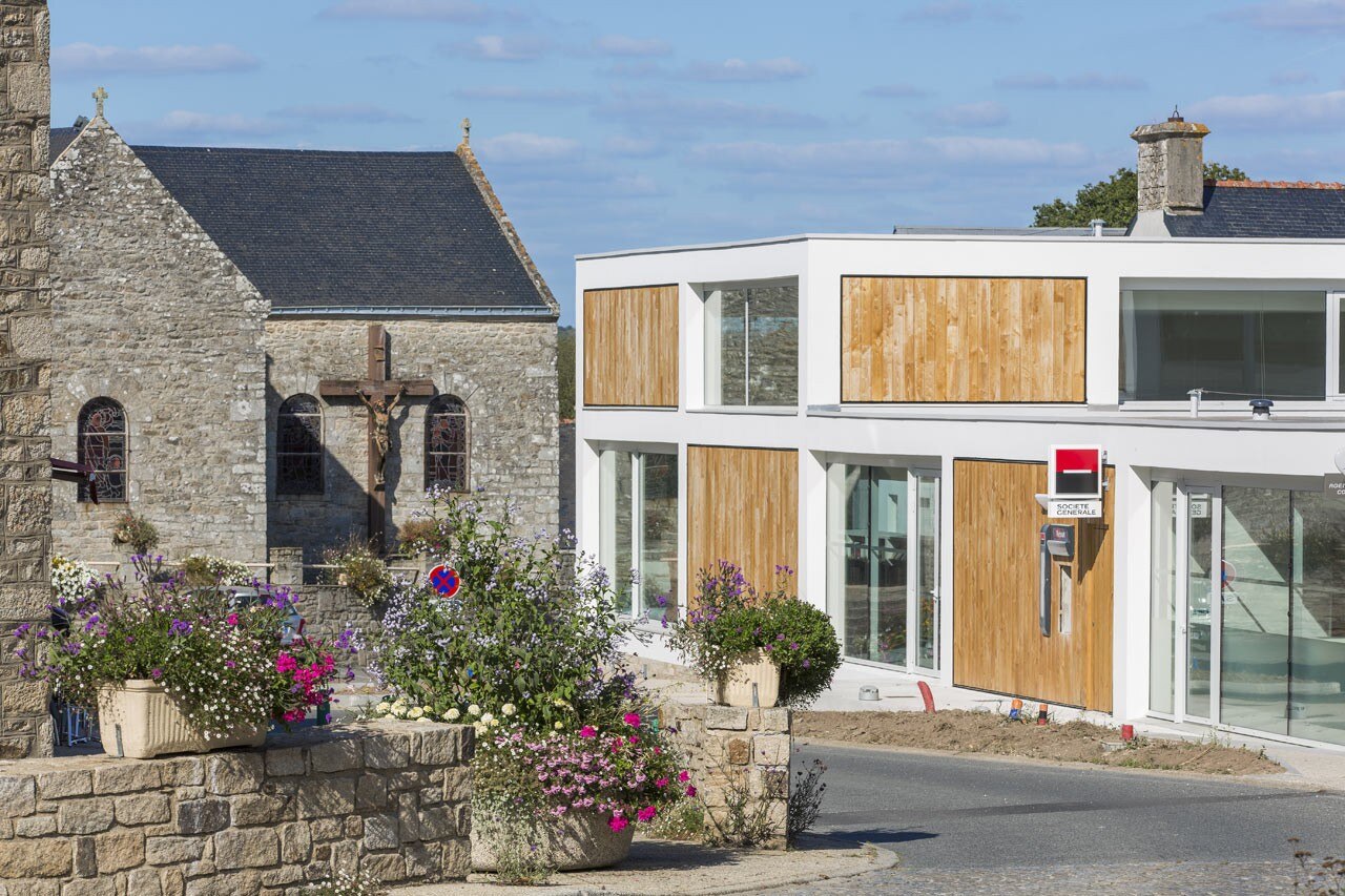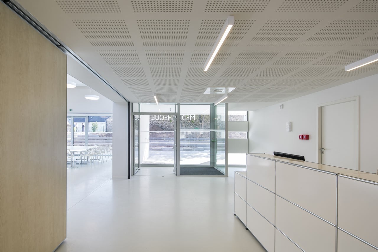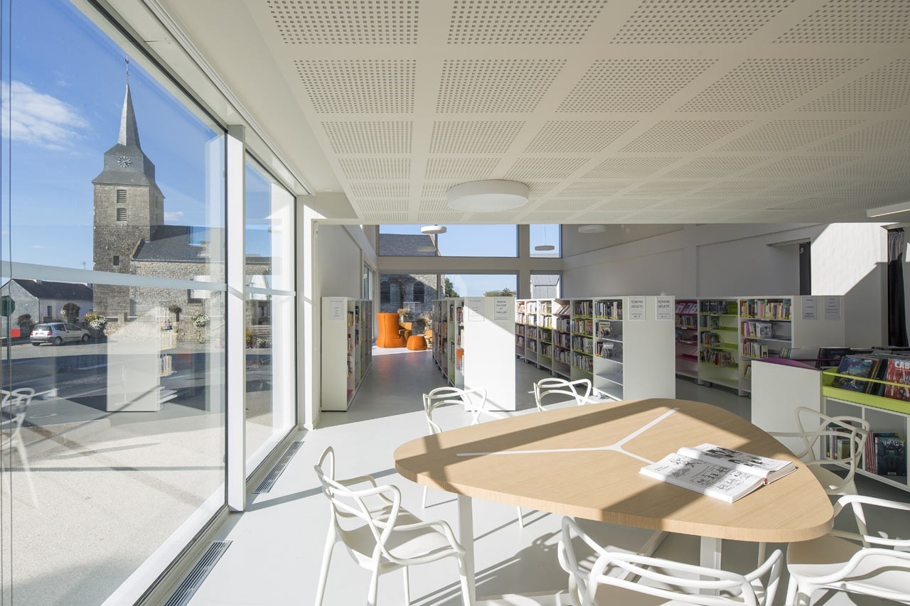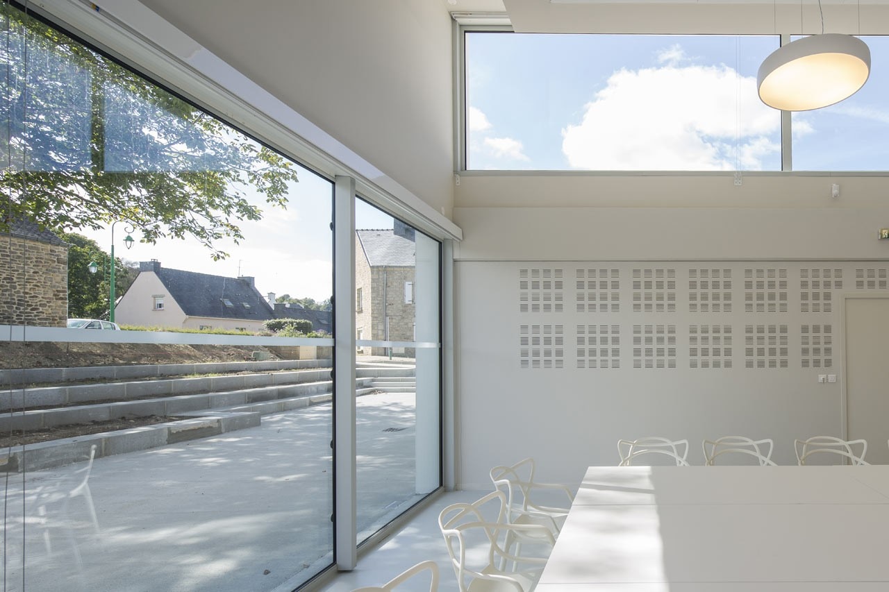 From the outside, the form, made from a stacking of volumes, converges perspectives from all points of view, thus translating and synthesizing the horizon of neighboring buildings. In addition, its mosaic system provides large openings that offer a panorama over the village.