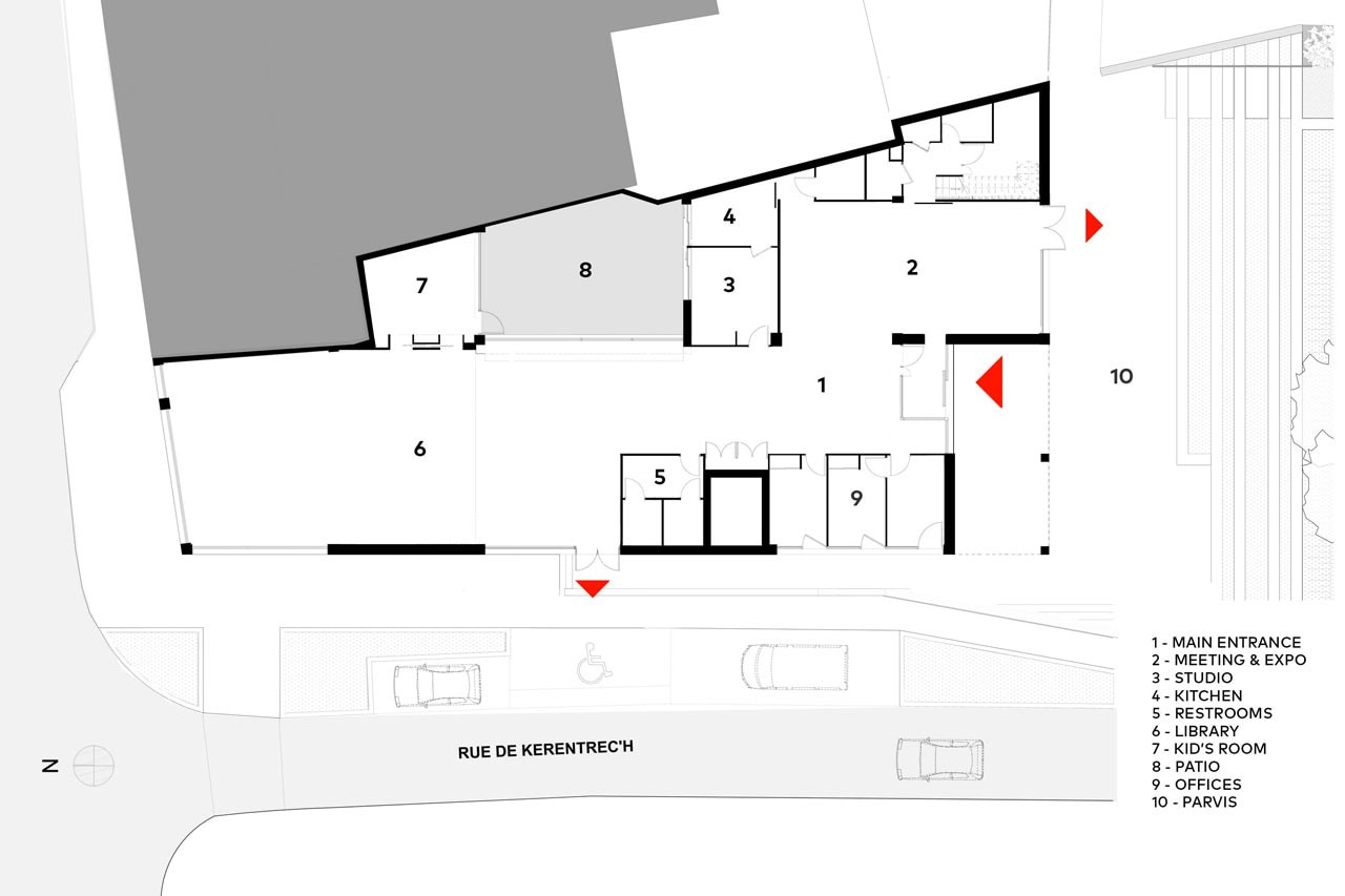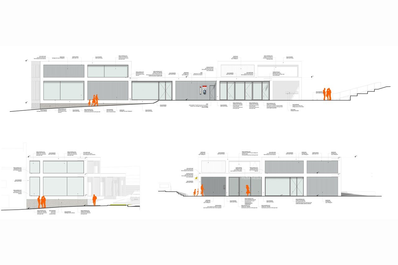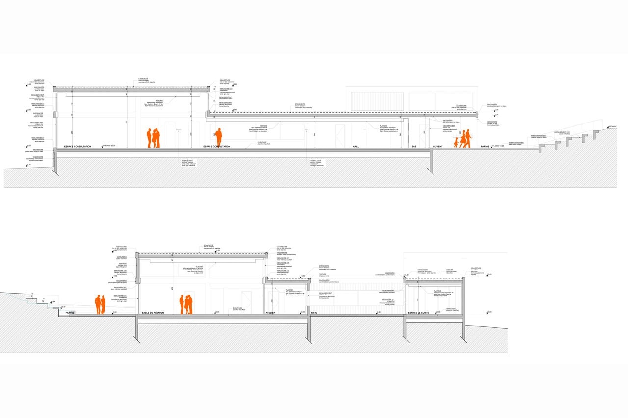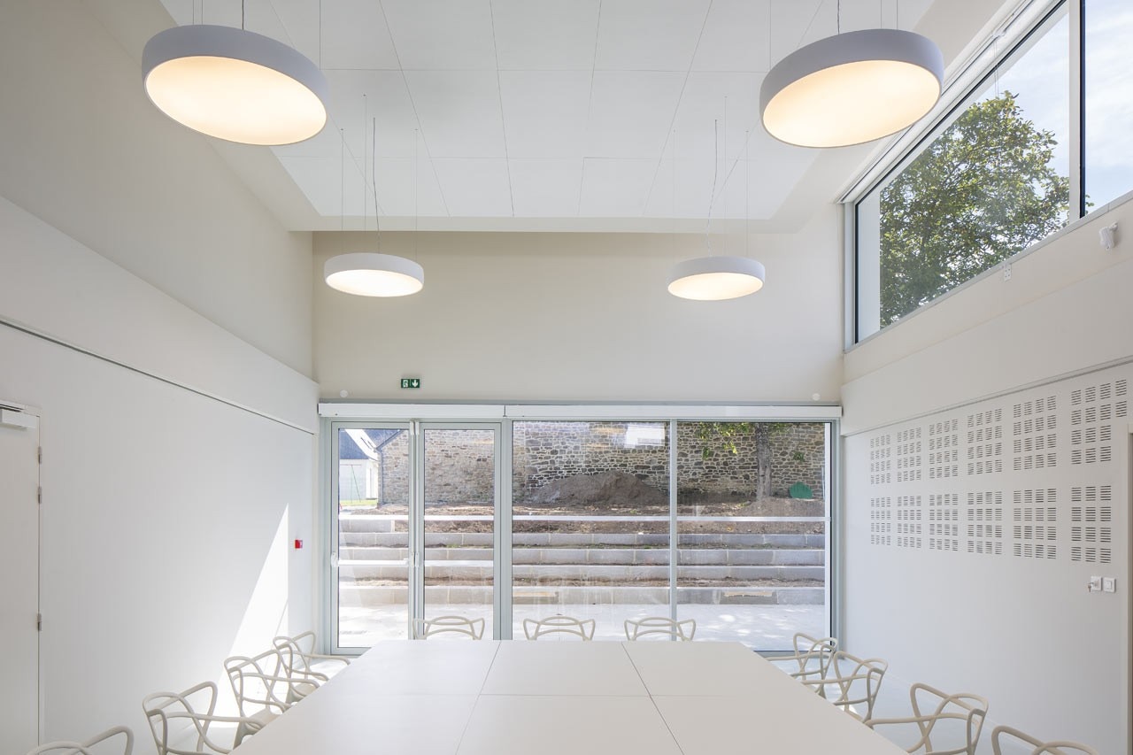 From the outside, the form, made from a stacking of volumes, converges perspectives from all points of view, thus translating and synthesizing the horizon of neighboring buildings. In addition, its mosaic system provides large openings that offer a panorama over the village.