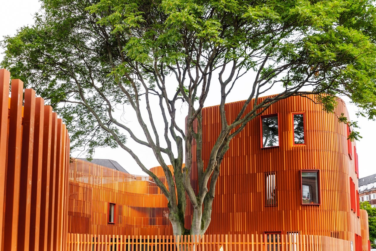 The facade of the kindergarten is a clear reference to the area’s red brick buildings. Instead of using traditional horizontal bricks, the facade consists of vertical brick lamellae continuing as a band from house to house, and surrounding the garden and playground. Besides being the building’s envelope, the facade thus works as a fence for the playground, protection at the roof tops and solar screening in front of the windows.
