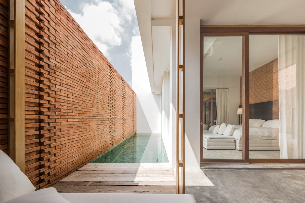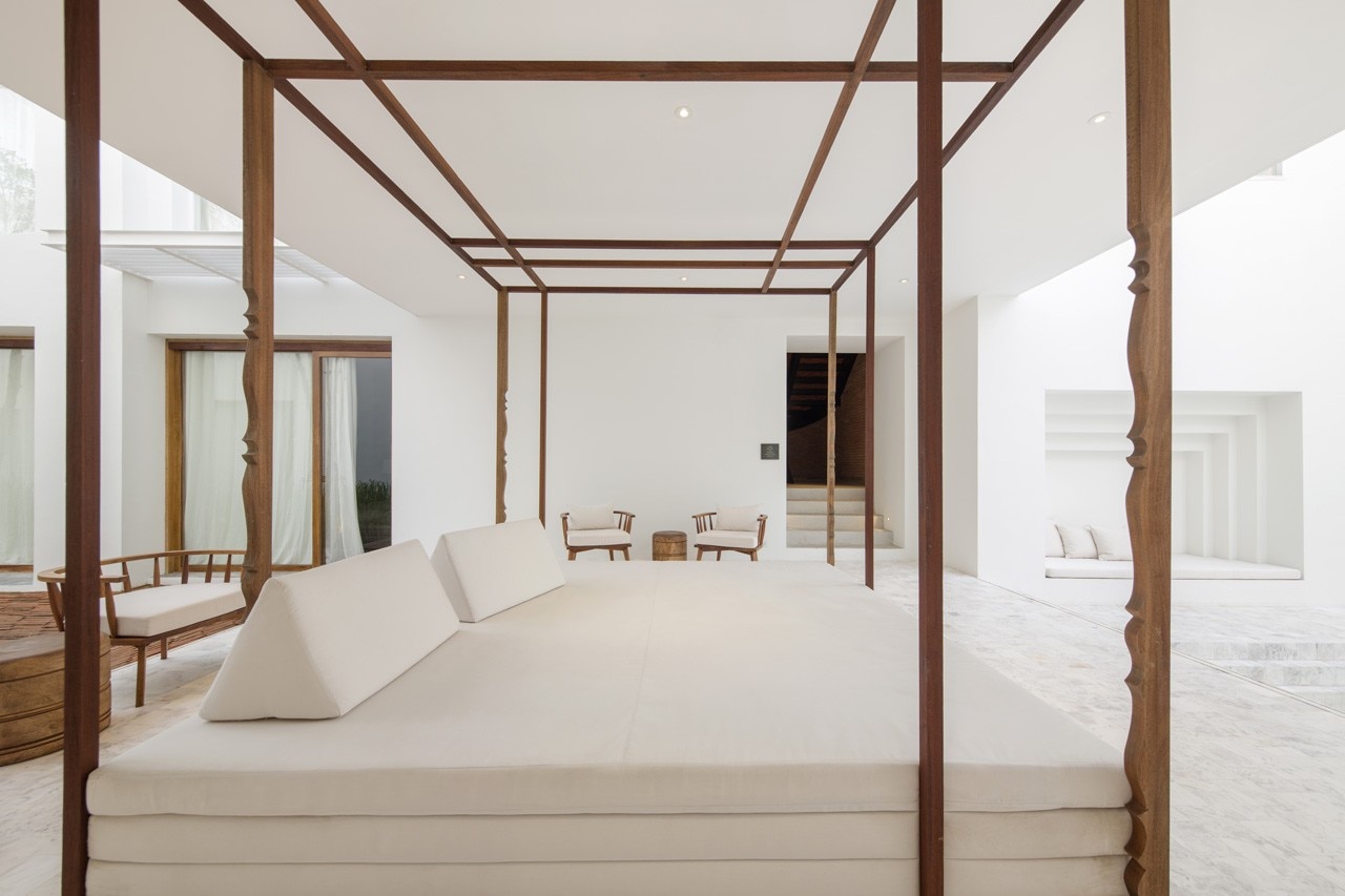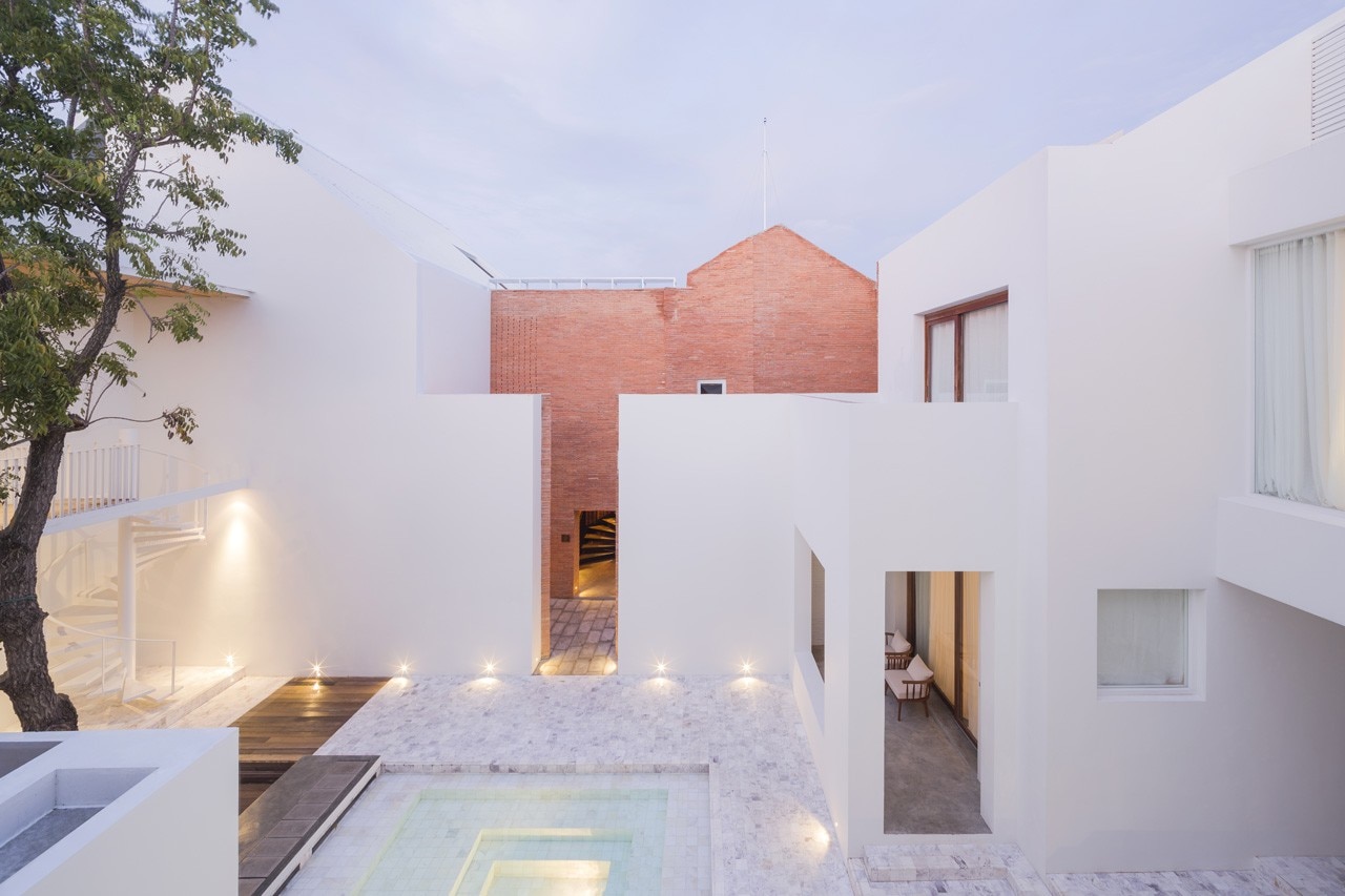 The pattern of steps, designed to be flooded, can be explained as an architectural element of Ayutthaya architecture. The architects have borrowed a reduced size of a corner of the Phutthai Sawan Stupa, scaled and redesigned it to frame various objects at Sala. This includes the interior and the exterior walls, the vertical and the horizontal planes, the furniture and the pillow cases.