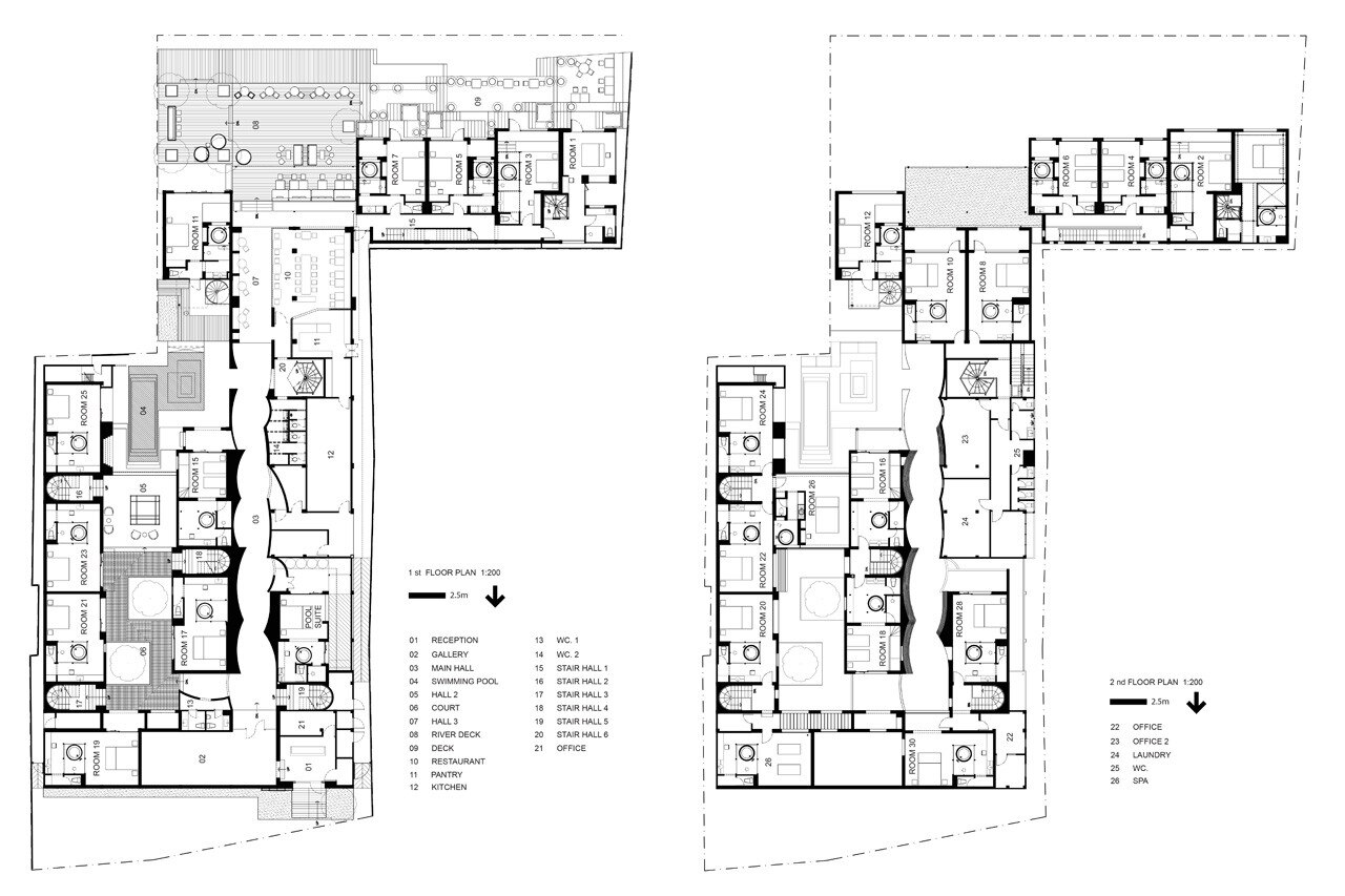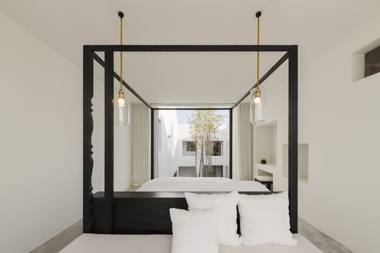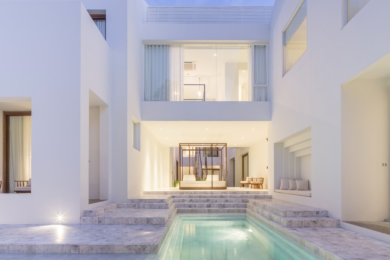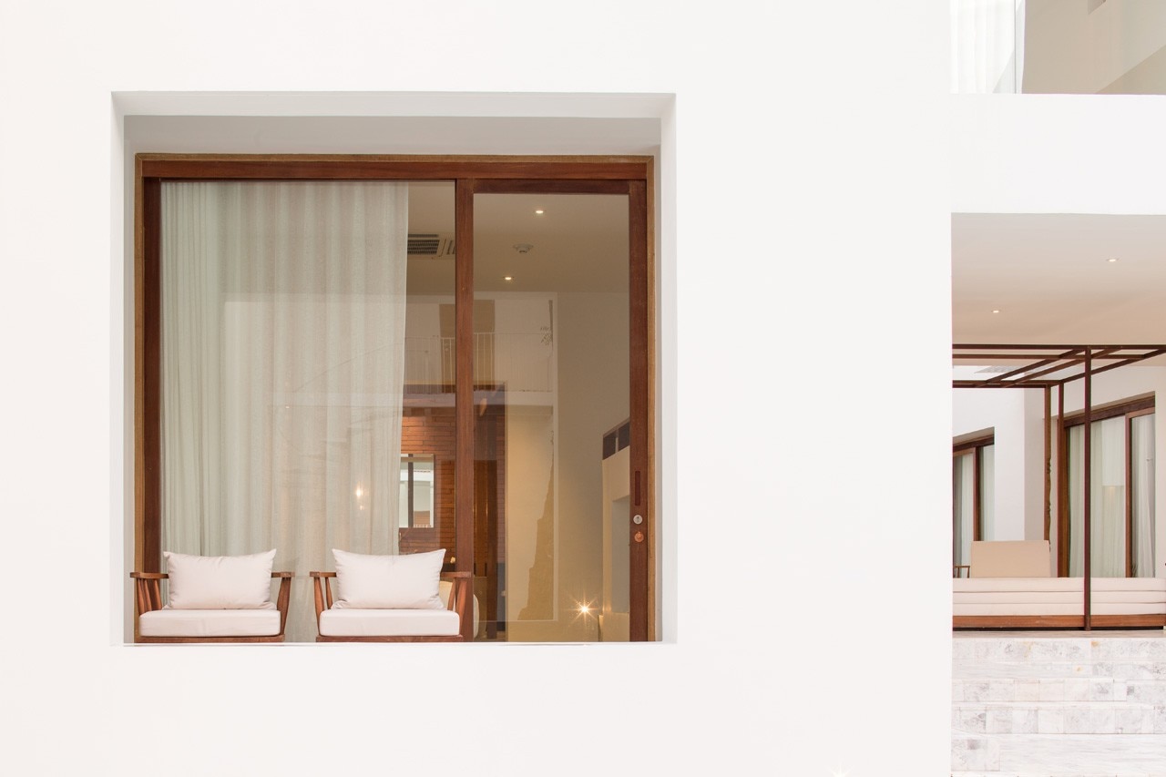 The pattern of steps, designed to be flooded, can be explained as an architectural element of Ayutthaya architecture. The architects have borrowed a reduced size of a corner of the Phutthai Sawan Stupa, scaled and redesigned it to frame various objects at Sala. This includes the interior and the exterior walls, the vertical and the horizontal planes, the furniture and the pillow cases.