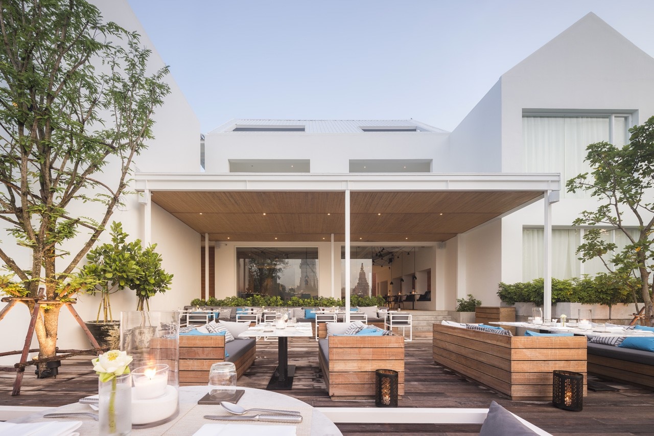 The panoramic view of Chao Phraya River and Putthai Sawan Temple cannot be seen from the brick walls courtyard. It can only be experienced passing through Sala Restaurant towards the riverfront deck. At this location, you can see another facade of Sala, white walls of gable houses, the arrangement of step decks and terraces along the waterfront.