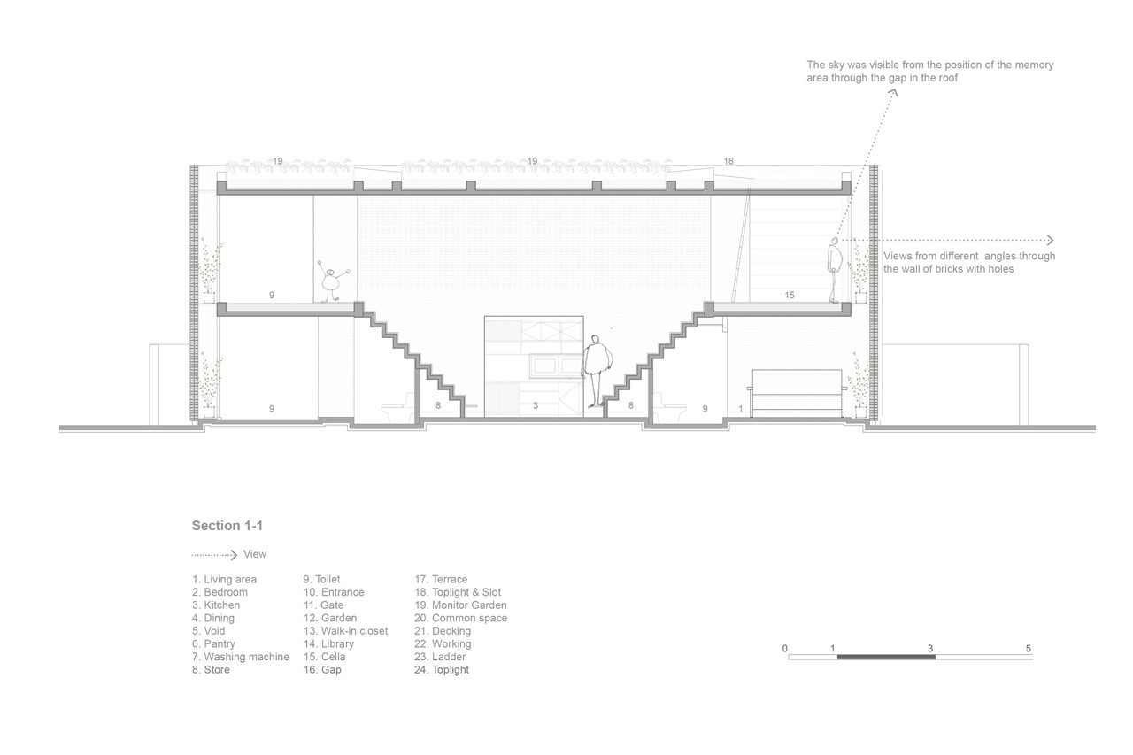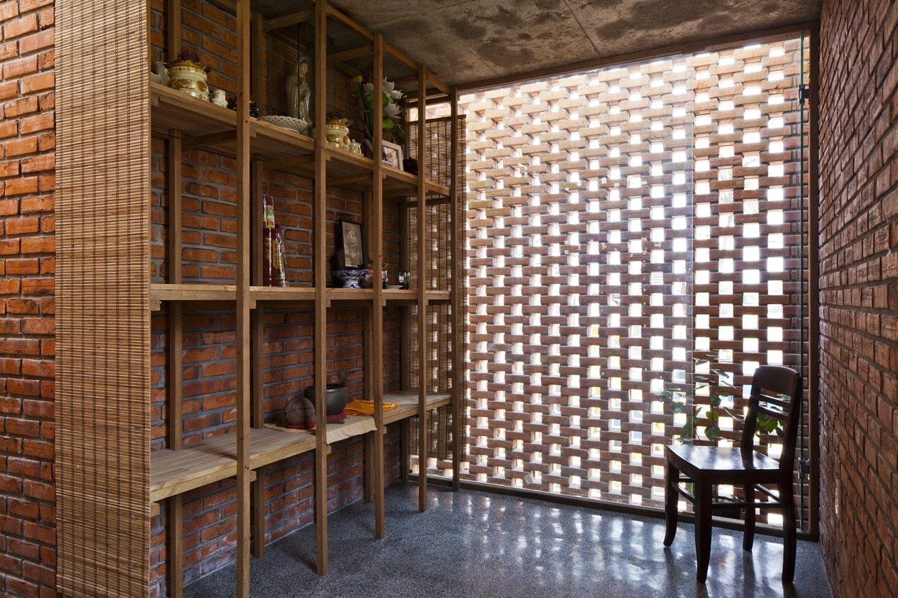 The mezzanine is where another bedroom, an altar room, and a small library are found. The attic is an open relaxing area with curtains of vines. Designed for three people, the house does not need a lot of partitions except the ones for the altar room and the bedrooms. Meanwhile, in the sharing areas in the house, the family members can still see and chat to each other through the walls with holes arranged as randomly but scientifically as in an actual termitary.