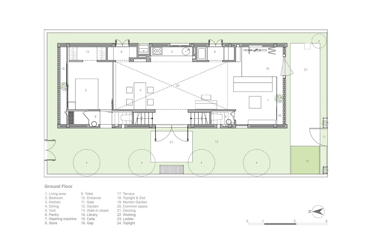 The special constructing technique of “double skins” with two layers of one brick wall covering outside and one glass-aluminum frame inside creates a space within a wall, which functions as a buffer layer at both gables. Besides, the arrangement of the toilets and the storage rooms along the walls not only helps block the strong winds during the stormy season but also leads them towards and through the gaps straight to the roof. This is due to the remarkable difference in pressure. On the roof, architects use a system of girders and upside down floors to create a small garden for plants – an ideal place for the whole family to relax and enjoy the breeze during the hot and muggy summer days.