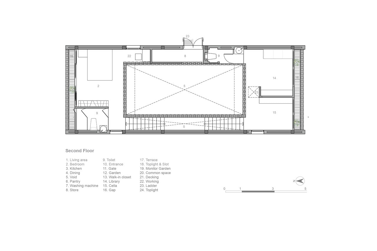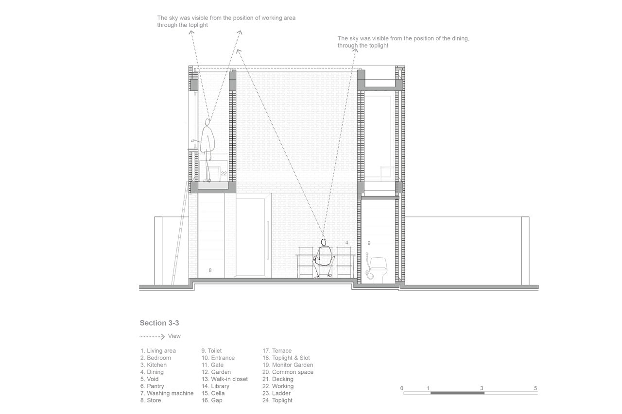 Inspired by the termites’ special ability to build their nests in the local area, the architect has designed the house with a large sharing space in the center where a cooking counter, a dining table, and an entertaining corner are found. This “lobby” then leads to different functional areas in the house such as the rest room, the living room, and the bedrooms.