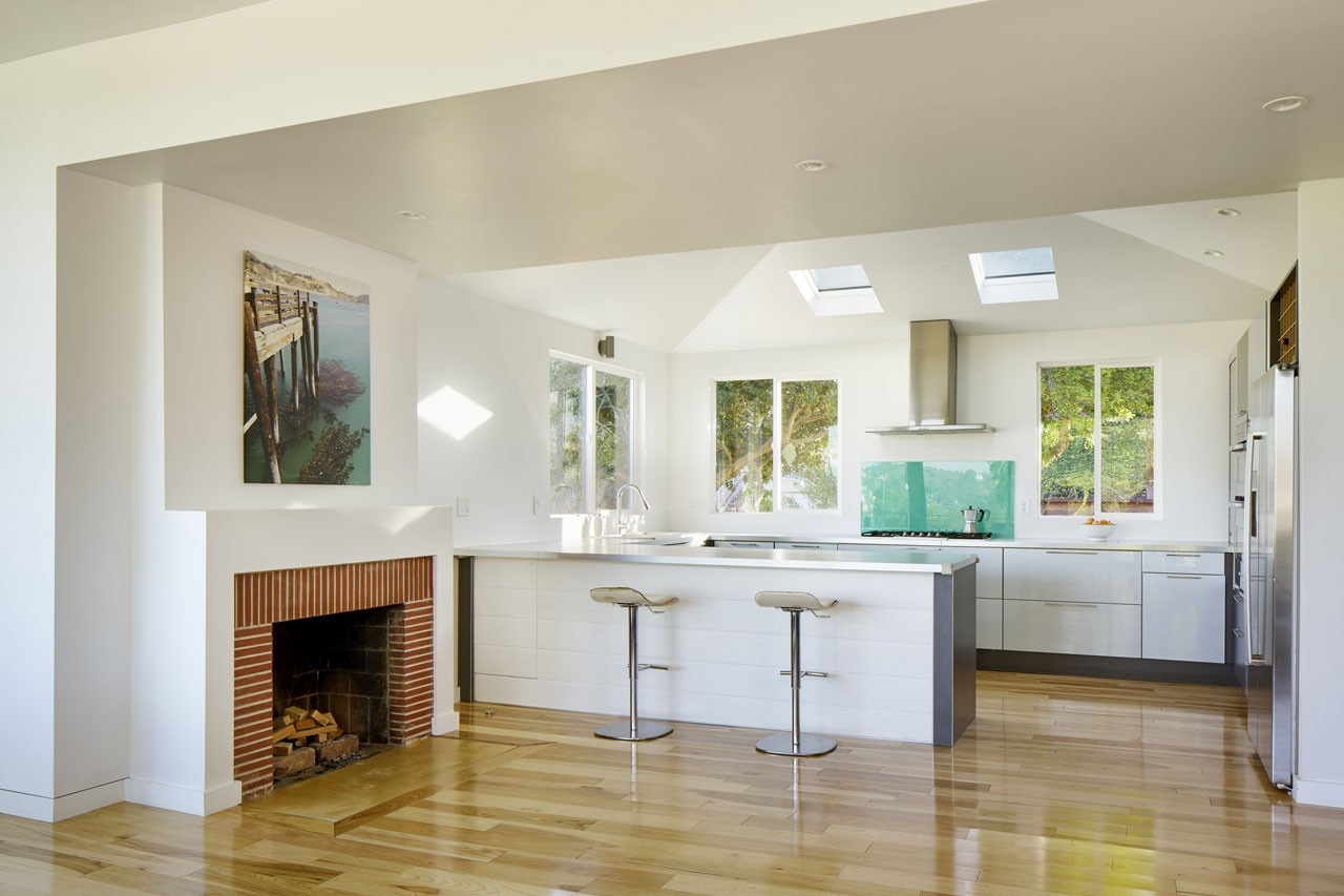 The roof of the main living space is punctured by a centrally placed skylight (reminiscent of ancient Roman compluvia, a centrally placed opening in the roof that brought in natural light and collected rainwater), which releases unwanted hot air out of the passively cooled space. Skylights also puncture the renovated kitchen which is now continuous with the living and dining areas. Together, these spaces flow out onto the new outdoor deck, where a sun-breaker frames the sky, transitioning from the interior to the exterior beyond.