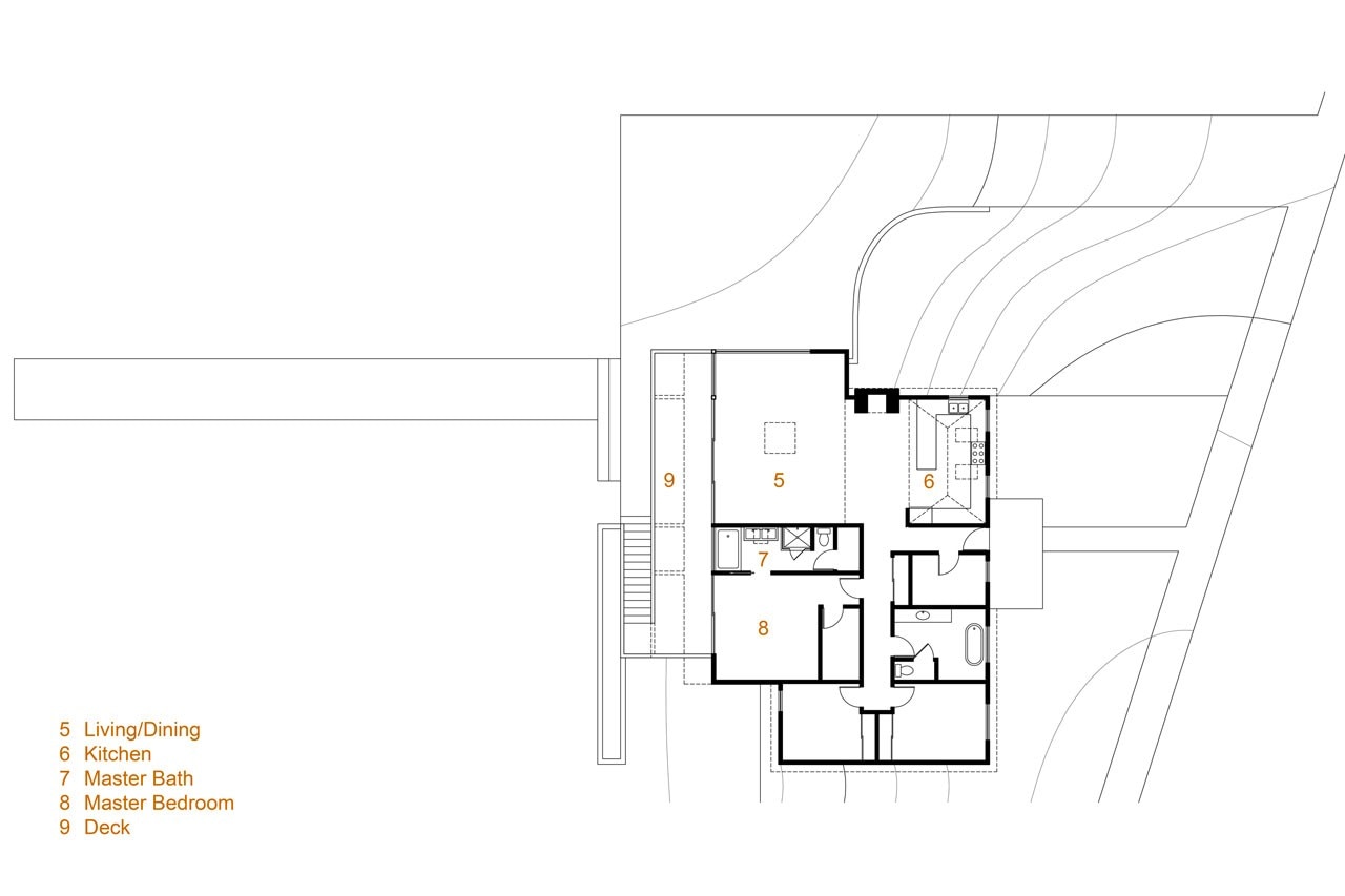 The living, dining, and master bedroom and bathroom areas were extended out from the back of the existing house within a contrasting wood-clad addition, forming a new carport underneath. The newly extended spaces have floor to ceiling glass walls, which let in an abundance of natural light and frame the expansive view.