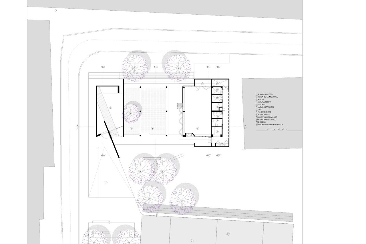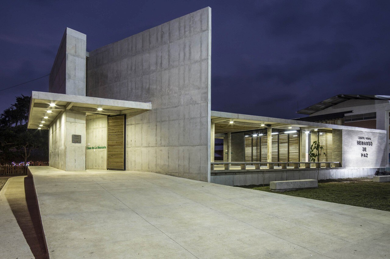 The tour begins in a large ramp, the main access to a building elevated from the ground, which protects the building from flooding of the Mulatos river, and whose dimensions allow it to also be an outdoor theater. The large ramp leads, accompanied by a diagonal wall 8 meters high, to the House of Memory, a space full of symbols that pay tribute to the victims of violence: light management, change in flooring as a symbol of not belonging to a place, a diagonal wall referring to the outburst of violence, the promenade through the “House of Memory” is obligatory to reach the rest of the building, because the future can not exist without knowing the past.