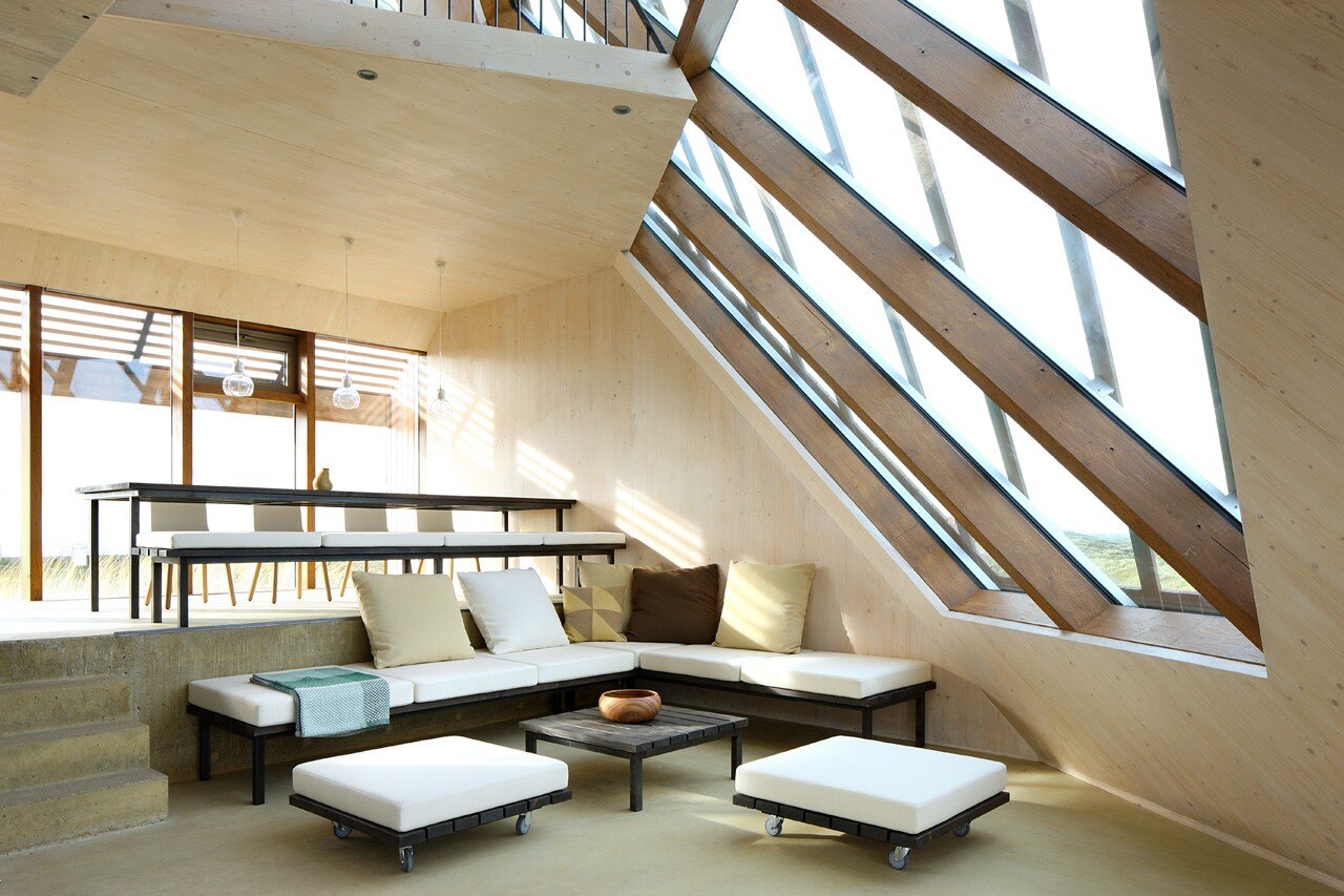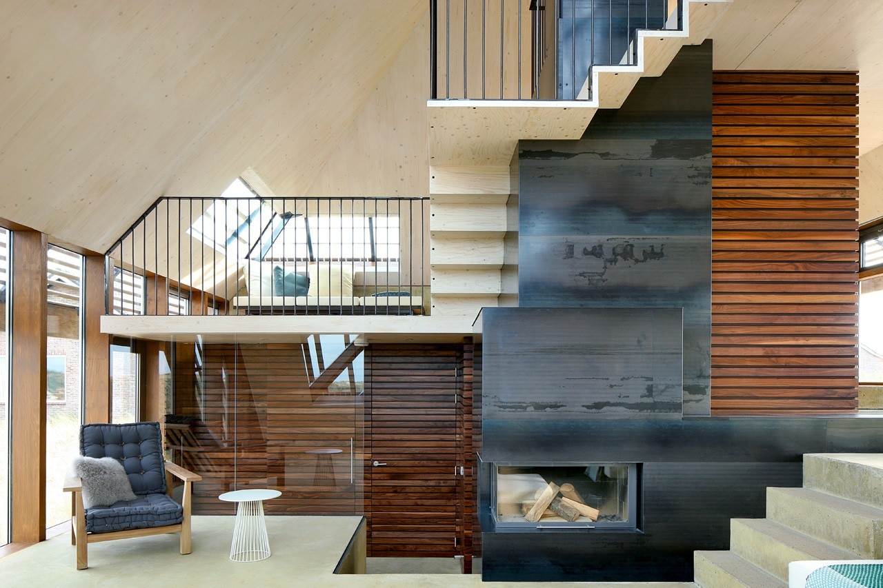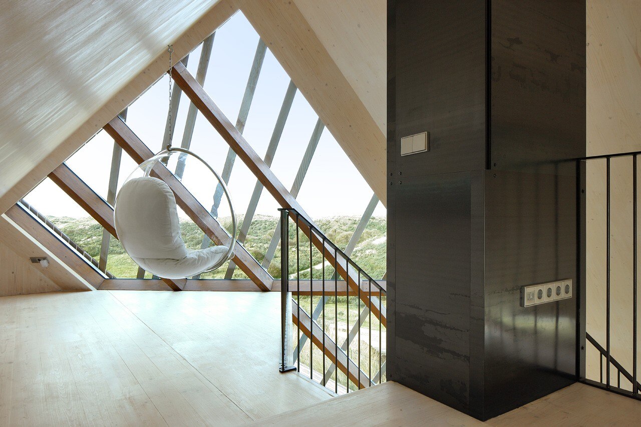 The loft-like house recreates the experience of having a walk on the dunes in its interior as a spiraling promenade architecturale around its core as one continuous path from platform to platform, each just a few steps higher than the next, that generates very interesting spatial and visual relations in between each of the rooms but also towards the landscape, as each opening in the house has been shaped, sized and positioned in a specific way, always related to the functions associated to each space.