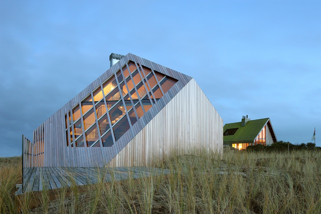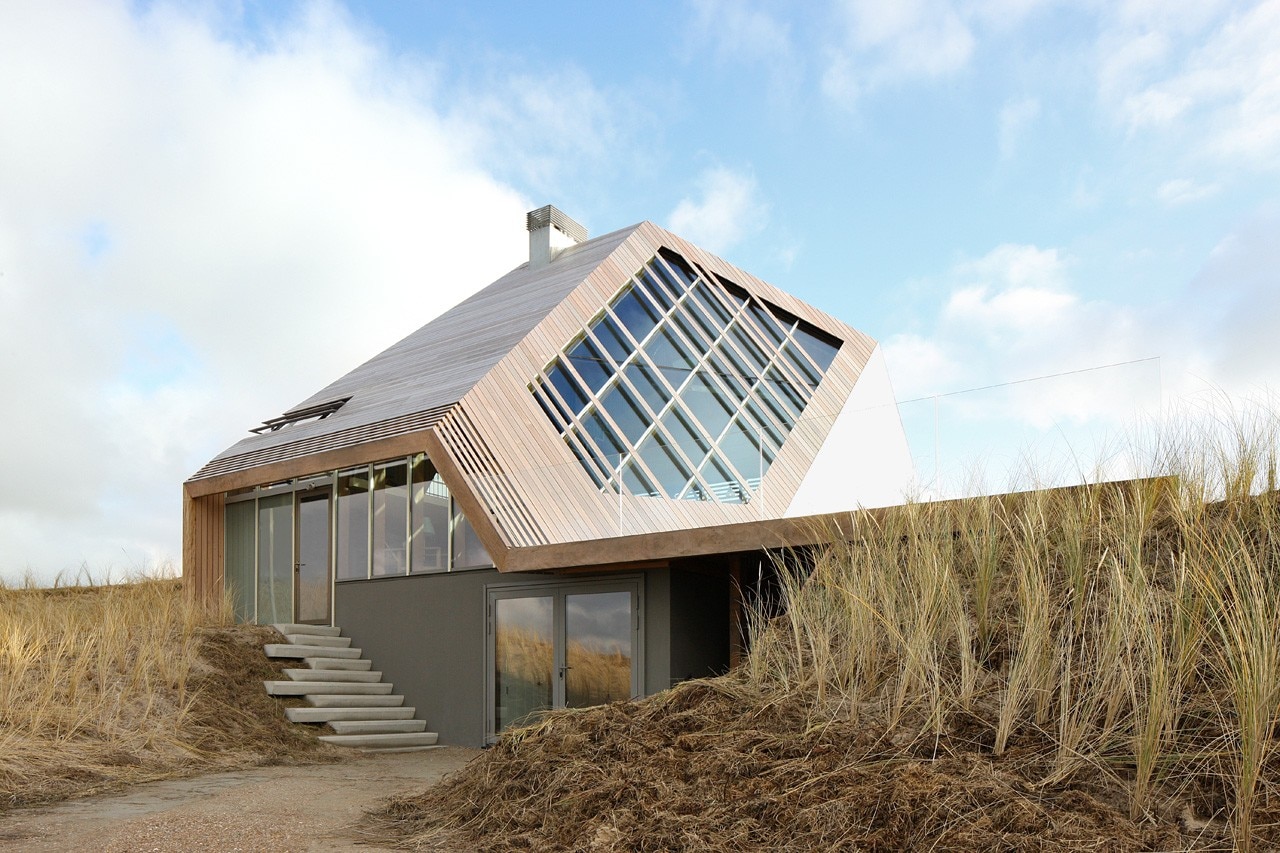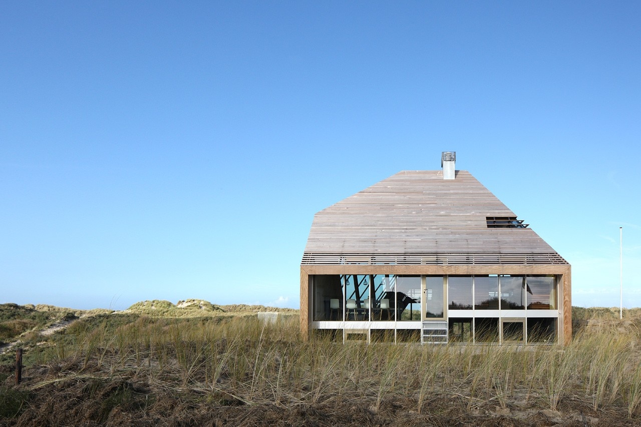 The loft-like house recreates the experience of having a walk on the dunes in its interior as a spiraling promenade architecturale around its core as one continuous path from platform to platform, each just a few steps higher than the next, that generates very interesting spatial and visual relations in between each of the rooms but also towards the landscape, as each opening in the house has been shaped, sized and positioned in a specific way, always related to the functions associated to each space.