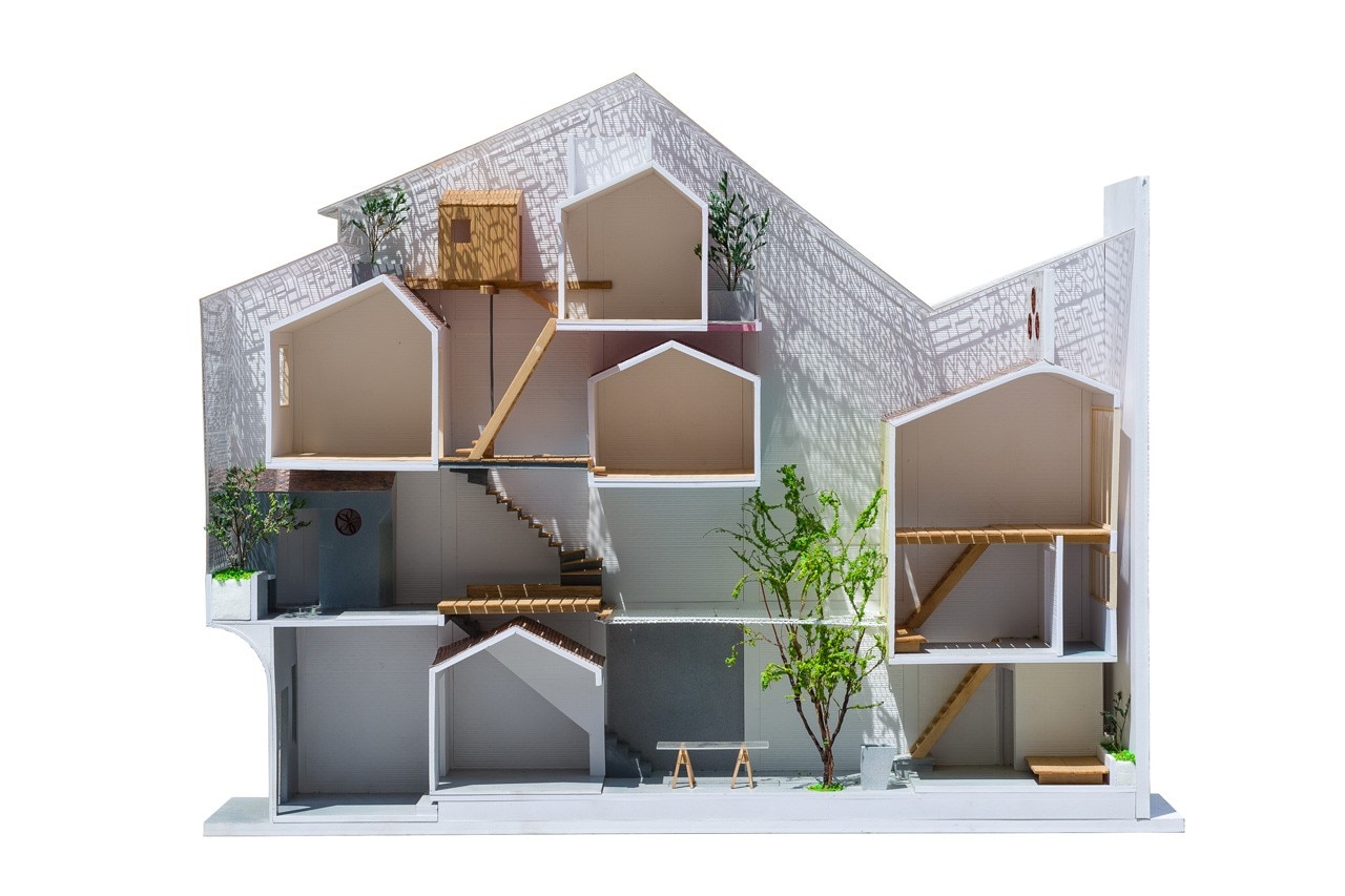 Taking advantage of the long and narrow plot the architects chose to distribute the rooms into individual dwellings suspended above each other around a common courtyard where a single tree grows.