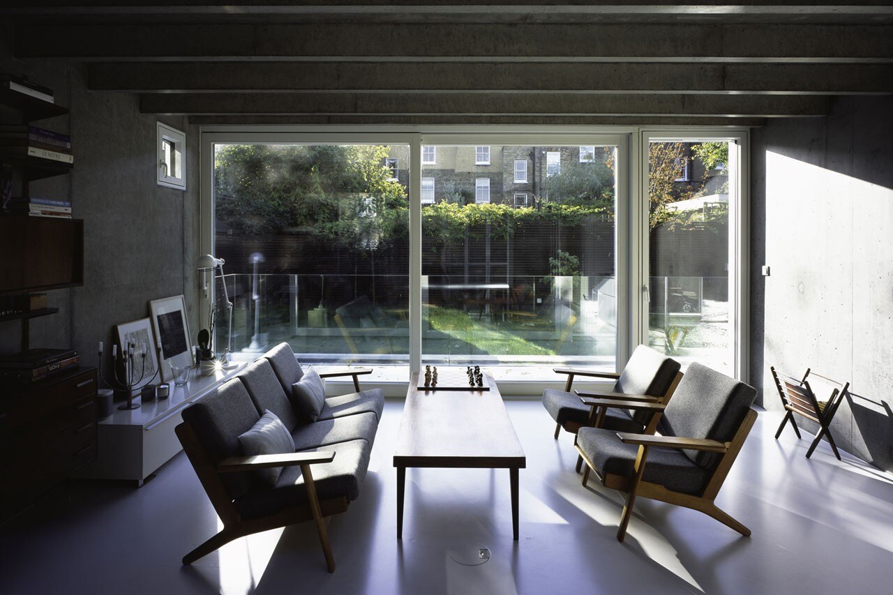 Set partially into the ground to limit its height and provide thermal mass, the house has lower floor lightwells and an elegant white concrete stair that effortlessly mediates the spatial experience between levels within a double height space.