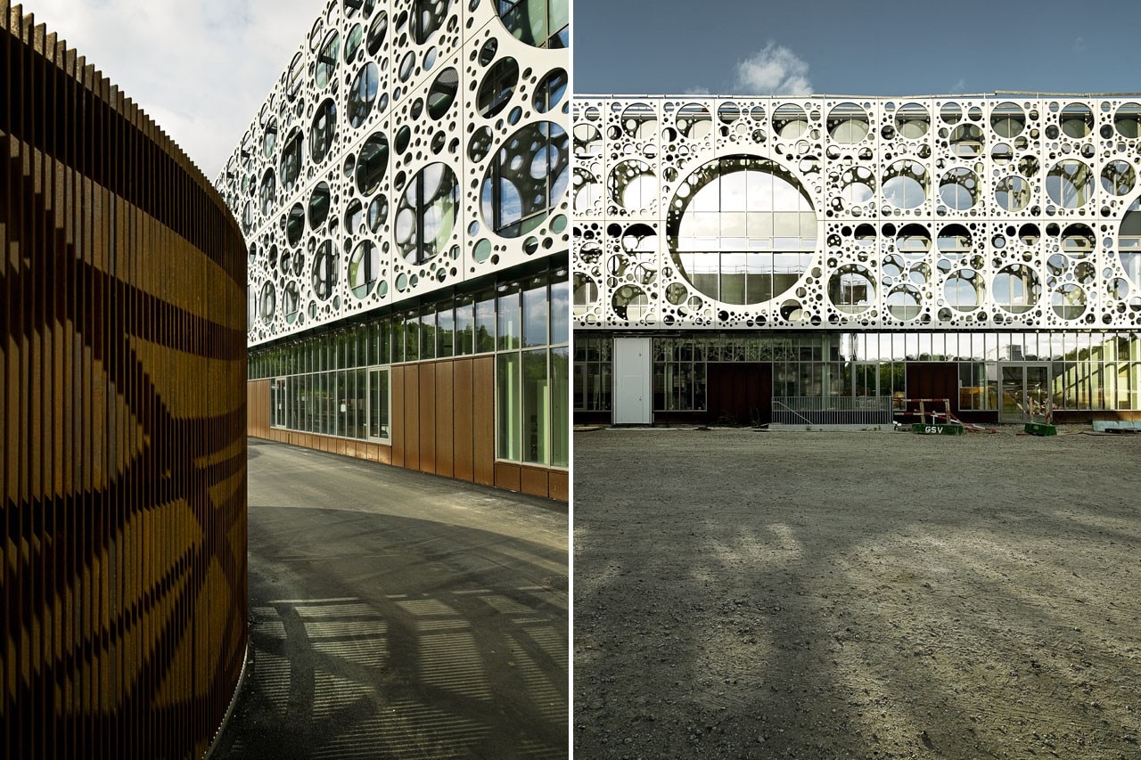 The composition of the facade screen is created from only seven different types of concrete panels, and the different diameters and layouts of the panels’ perforation patterns have been optimized to act as a solar screen and glare protection, reducing direct sunlight by up to 50 percent, while still allowing unobstructed views from all interior spaces to the green surroundings.